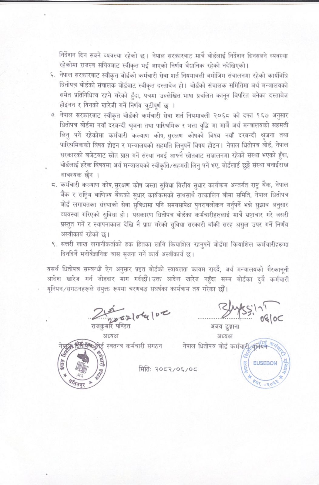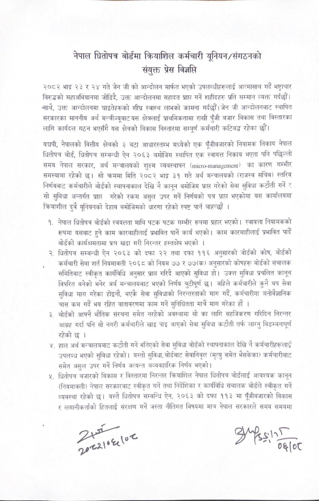 मन्त्रालयको यो पत्रसँगै धितोपत्र बोर्डका दुई कर्मचारी युनियन नेपाल धितोपत्र बोर्ड स्वतन्त्र कर्मचारी संगठन र नेपाल धितोपत्र बोर्ड कर्मचारी युनियनले सबै कर्मचारीको साथ लिएर २२ दिनदेखी आन्दोलन गरिरहेका छन् ।