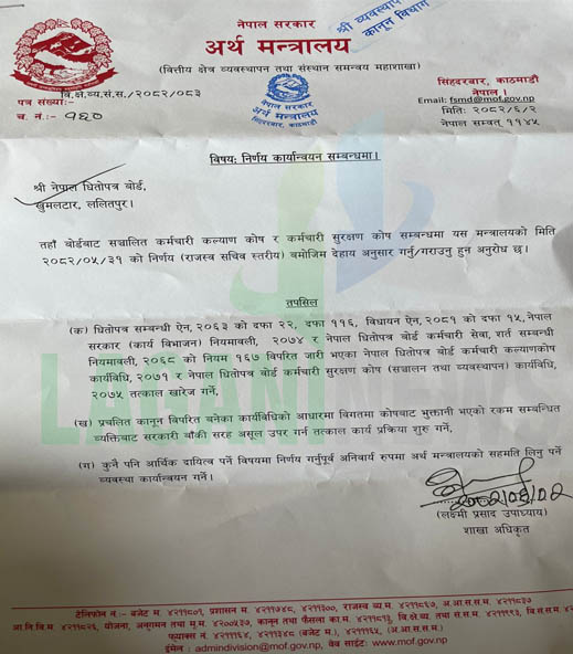 सो मन्त्रालयले असोज २ गते बोर्डलाई ‘धितोपत्रसम्बन्धी ऐन, २०६३ को दफा २२, दफा ११६, विधायन ऐन, २०८१ को दफा १५, नेपाल सरकार (कार्य विभाजन) नियमावली, २०७४ र नेपाल धितोपत्र बोर्ड कर्मचारी सेवा, शर्तसम्बन्धी नियमावली, २०६८ को नियम १६७ विपरीत जारी भएका नेपाल धितोपत्र बोर्ड कर्मचारी कल्याणकोष कार्यविधि, २०७१ र नेपाल धितोपत्र वोर्ड कर्मचारी सुरक्षण कोष (सञ्चालन तथा व्यवस्थापन) कार्यविधि, २०७५ तत्काल खारेज गर्ने’ भन्ने पत्र पठायो ।