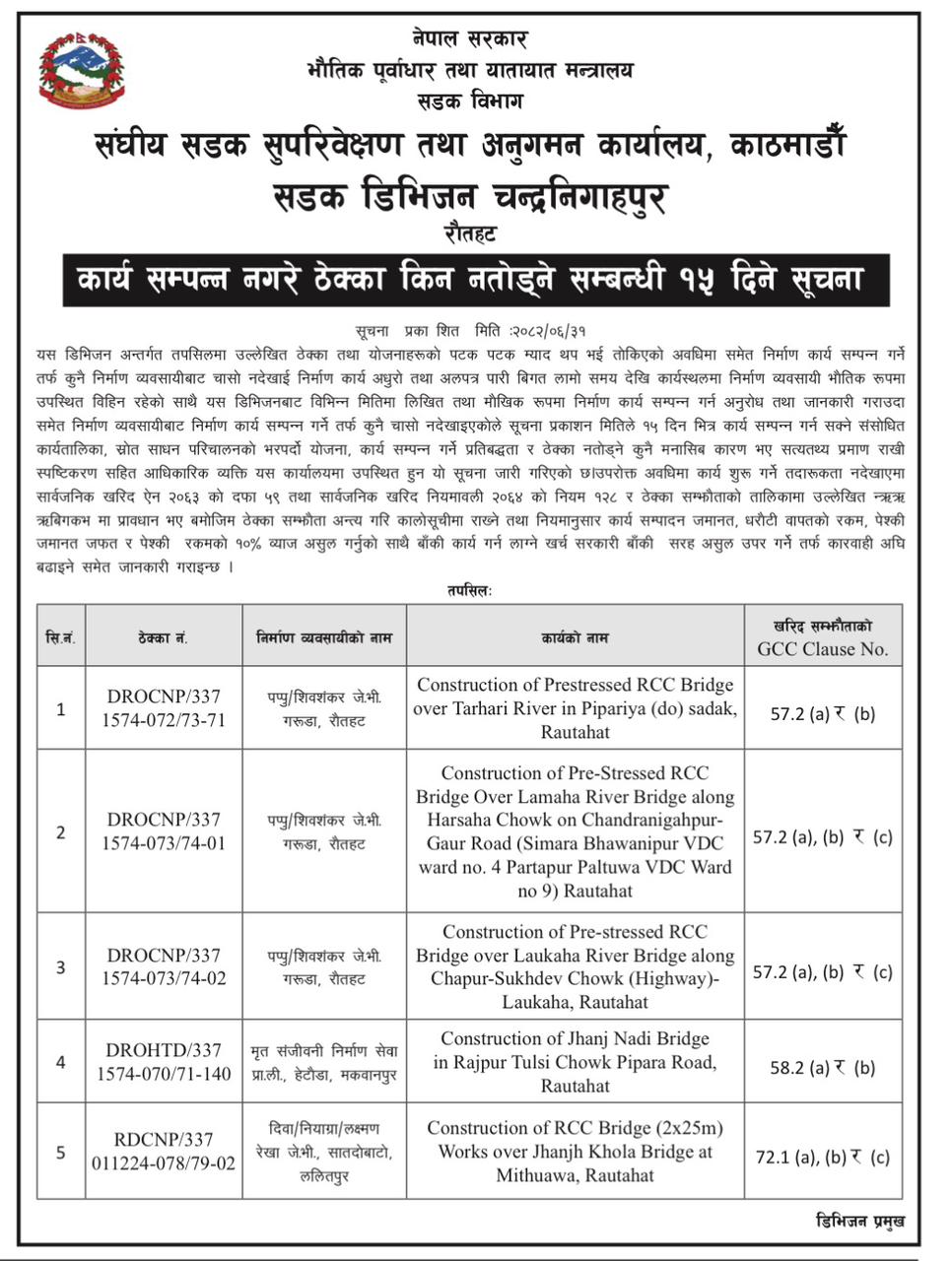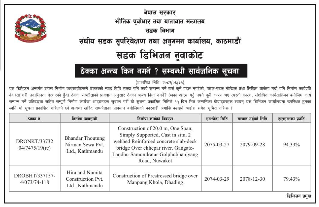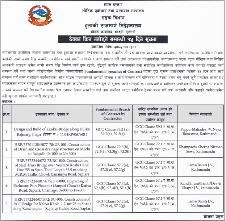 सडक डिभिजन कार्यालय विराटनगर, चन्द्रनिगाहपुर तथा निर्देशनालयले पाँच-पाँच र नुवाकोटले २ वटा गरी १७ वटा ठेक्का किन नतोड्ने ? भन्दै शुक्रबार सार्वजनिक सूचना जारी गरेका छन् । ठेका तोड्न प्रक्रिया बढाइएका अधिकांश पुल निर्माणका रहेका छन् ।