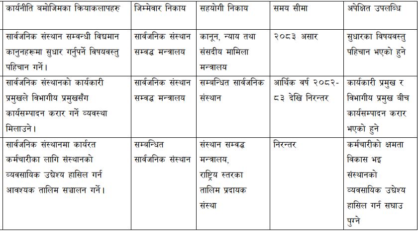 सार्वजनिक संस्थानको संगठन तथा व्यवस्थापन सर्वेक्षण कार्य सम्पन्न गरी अनावश्यक र असान्दर्भिक दरबन्दी खारेज गरिने, सार्वजनिक संस्थानको सँगठन संरचनालाइ कार्यगत र फ्ल्याट बनाइने रणनीति रहेको छ । सार्वजनिक संस्थानमा सम्पादन हुने कार्य लाग्ने समय र निर्णयका तह प्रष्ट गरिने, सार्वजनिक संस्थानका विभागीय प्रमुख कार्यालय प्रमुख र सेवाकेन्द्र वा इकाई प्रमुखको कार्य जिम्मेवारी स्पष्ट तोकिने रणनीतिमा उल्लेख छ ।