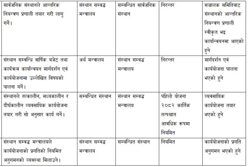 सार्वजनिक संस्थानको समग्र निर्णय प्रक्रिया र कार्यसम्पादनमा प्रचलित कानुनको अधीनमा रही सञ्चालक समिति र व्यवस्थापनलाई पूर्ण रूपमा जिम्मेवार बनाइने, सरकारले निर्देशन दिनु बाहेक संस्थानको दैनिक कार्यमा हस्तक्षेप नगर्ने व्यवस्था मिलाइने रणनीतिक रहेको छ ।