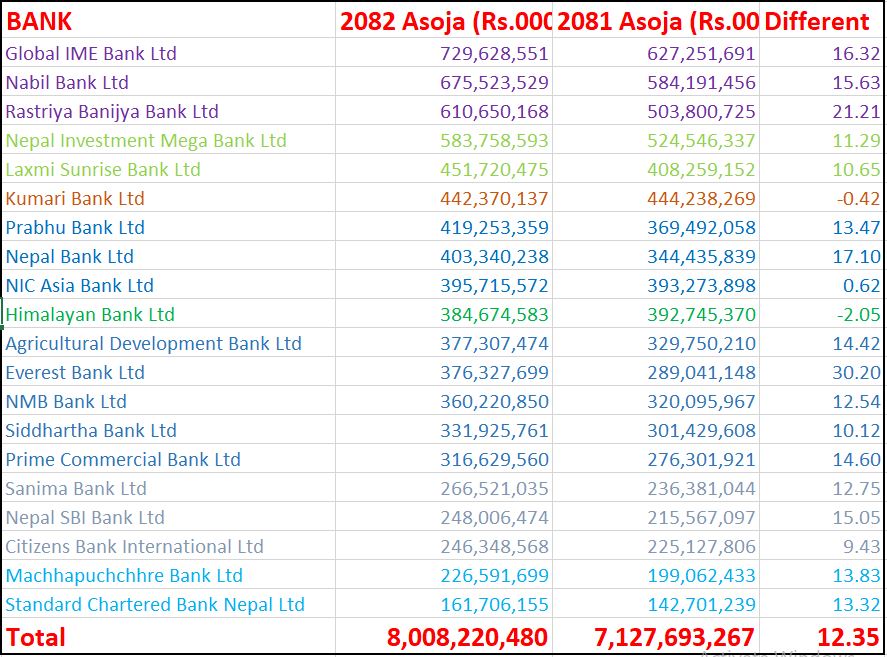 बैंकहरुले प्रकाशित गरेको विवरण अनुसार कृषि विकास बैंकको सम्पत्ति १४.४२ प्रतिशतले बढेर ३ खर्ब ७७ अर्ब ३० करोड ७४ लाख ७४ हजार, एभरेष्ट बैंकको ३०.२० प्रतिशतले बढेर ३ खर्ब ७६ अर्ब ३२ करोड ७६ लाख ९९ हजार, एनएमबी बैंकको १२.५४ प्रतिशतले बढेर ३ खर्ब ६० अर्ब २२ करोड ८ लाख ५० हजार, सिद्धार्थ बैंकको १०.१२ प्रतिशतले बढेर ३ खर्ब ३१ अर्ब ९२ करोड ५७ लाख ६१ हजार रुपैयाँ रहेको छ ।