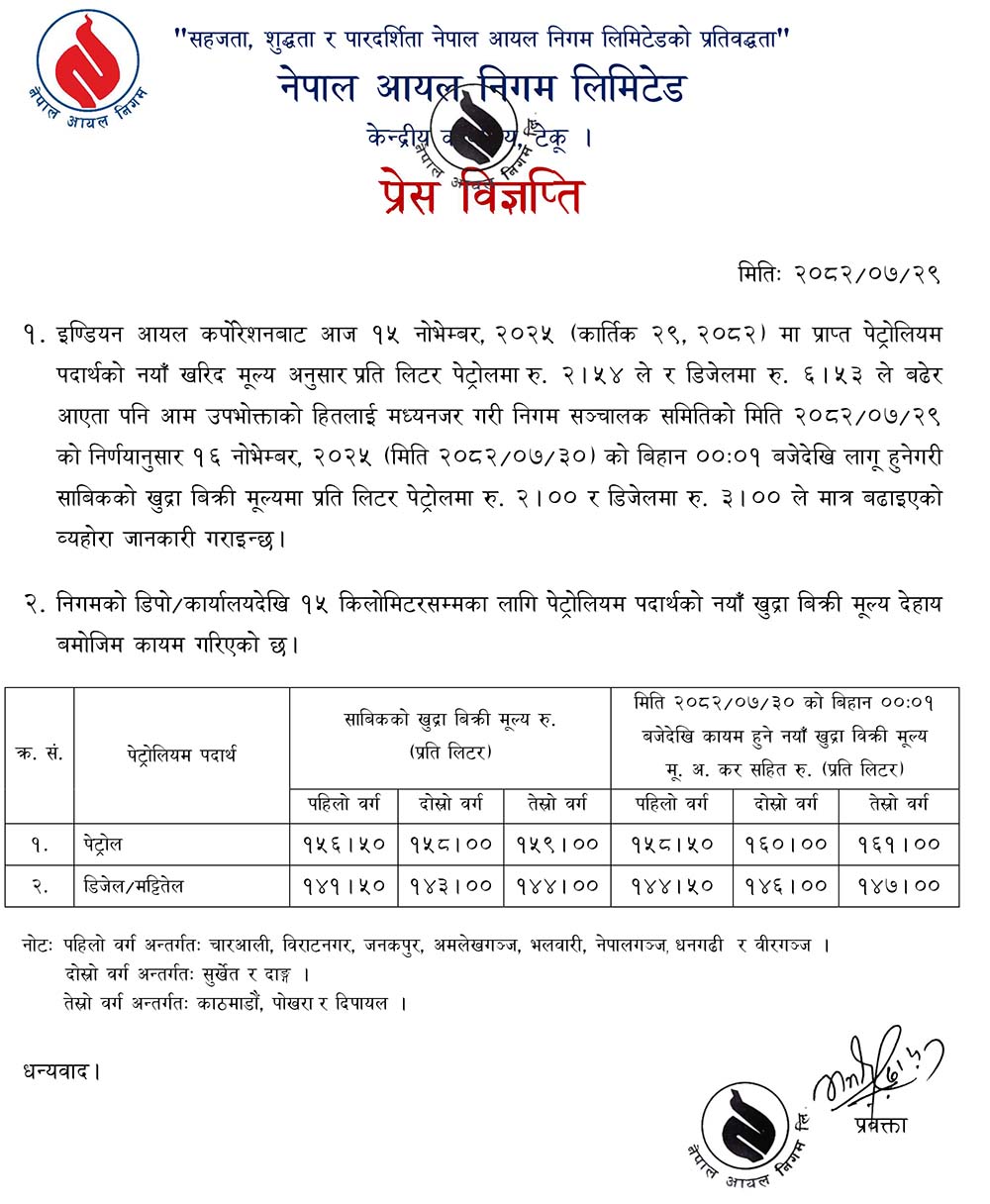 निगमले शनिबार राति १२ बजेदेखि लागु हुने गरि पेट्रोलमा प्रतिलिटर २ र डिजल-मट्टीतेलमा प्रतिलिटर ३ रुपैयाँ बढाएको हो ।