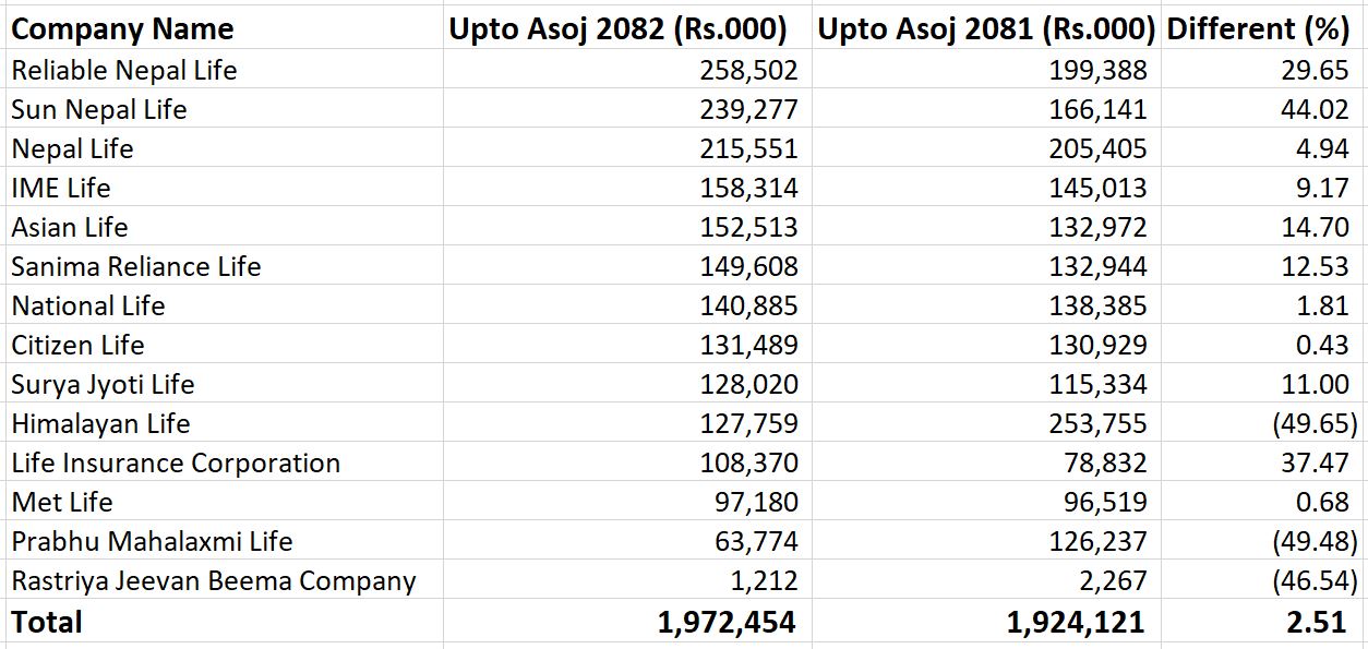 यस्तै नेशनल लाइफको नाफा १.८१ प्रतिशतले बढेर १४ करोड ८ लाख, सिटिजन लाइफको नाफा ०.४३ प्रतिशतले बढेर १३ करोड १४ लाख, सूर्यज्योति लाइफको नाफा ११ प्रतिशतले बढेर १२ करोड ८० लाख, लाइफ इन्स्योरेन्स कर्पोरेशनको नाफा ३७.४७ प्रतिशतले बढेर १० करोड ८३ लाख र मेट लाइफको नाफा ०.६८ प्रतिशतले बढेर ९ करोड ७१ लाख रुपैयाँ पुगेको छ ।