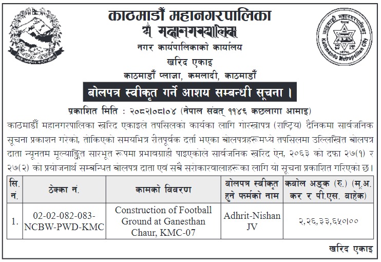 २ करोड २६ लाख ३३ हजार ६५० रुपैयाँमा लागतमा उक्त फुटबल खेलमैदान बनाउन लागेको जानकारी दिएको छ । फुटबल खेलमैदान बनाउनको लागि अधृत–निशान जेभीले टेन्डर हात पारेको छ ।