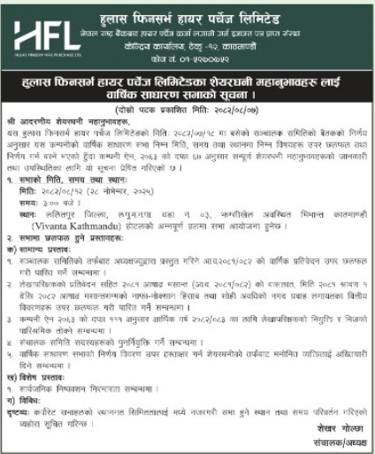 काठमाडौं । औद्योगिक घराना गोल्छा समूह अन्तर्गतको कर्जा प्रदायक कम्पनी हुलास फिनसर्भ हायर पर्चेज कम्पनीले सर्वसाधारण सेयर (आईपीओ) जारी गर्ने विषेस प्रस्ताव सहित साधारण सभा बोलाएको छ । कम्पनीले कात्तिक १२ गते साधारणसभा बोलाएको हो ।