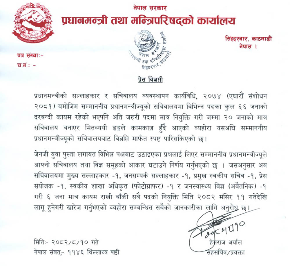 प्रधानमन्त्री कार्कीको सचिवालयबाट हटाइयो १४ जना, अब ६ मात्रै बाँकी