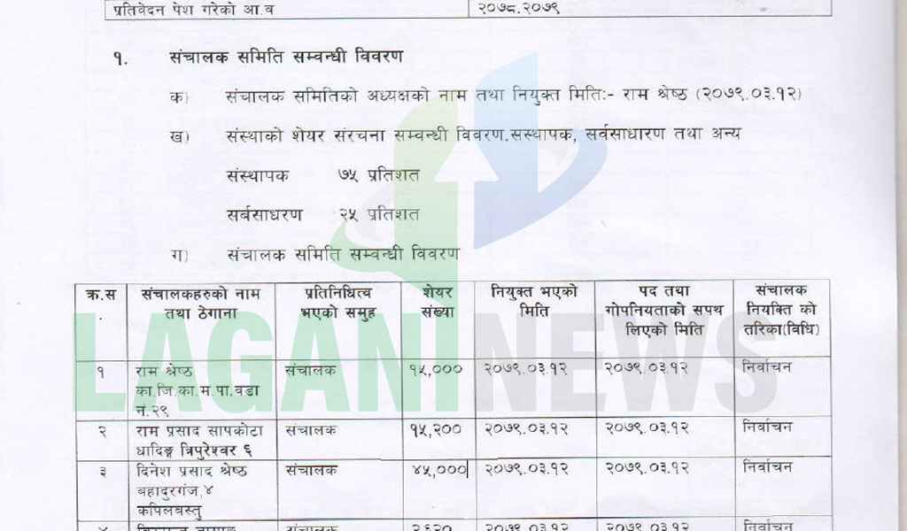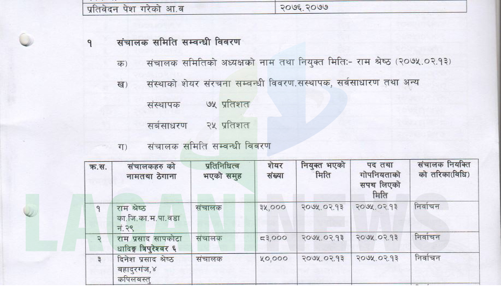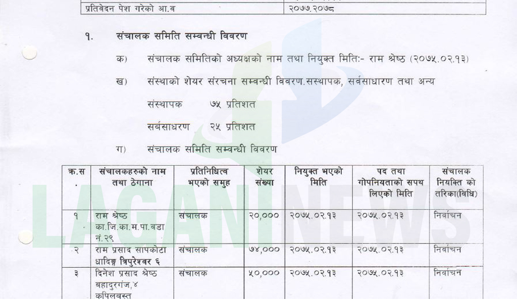 यस्तै अर्का सञ्चालक दिनेशप्रसाद श्रेष्ठसँग २०७६ मा ५० हजार कित्ता सेयर थियो । त्यसको २ वर्षपछि उनले ५ हजार कित्ता सेयर बिक्री गरे । अहिले उनीसँग ४५ हजार कित्ता सेयर बाँकी छ । अध्यक्ष श्रेष्ठ र सञ्चालक सापकोटाले आफ्नो कार्यकालमा २ पटक सेयर बिक्री गरे । अर्का सञ्चालक श्रेष्ठले भने एक पटक मात्रै सेयर बिक्री गरेको तथ्यले पुष्टि भएको छ । यी तीन जना अहिले पनि कम्पनीमा अध्यक्ष तथा सञ्चालक छन् ।
