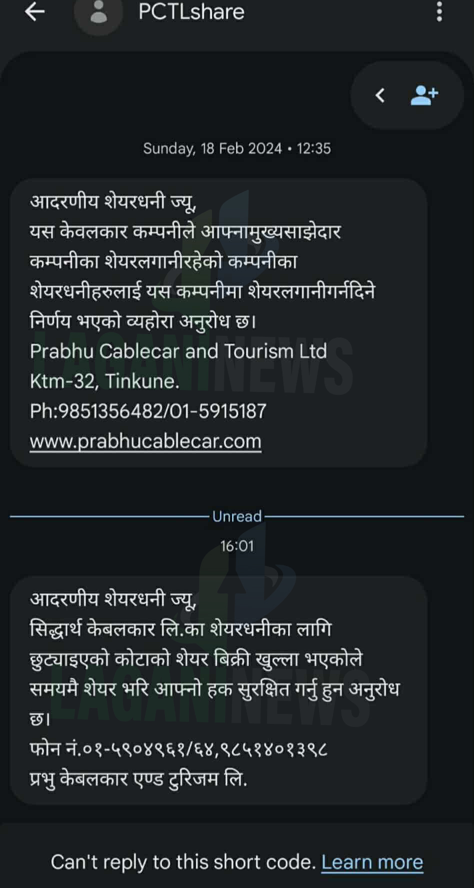 यता, आइतबार सेयरधनीको मोबाइलमा म्यासेज गरेर सेयर किन्न भनेको छ । प्रभु ग्रुप्सका अध्यक्ष भोजकुमार खड्का (श्याम) ले हकप्रद सेयर किन्ने समय सकिएको स्वीकारे । तर, आईतबार पठाइएको सेयर किन्ने सन्देश हकप्रद हो वा अन्य केही हो भन्ने लगानी न्यूजको प्रश्नमा भने ‘हैन, खै हकप्रद सेयर किन्ने समय सकियो’ भन्ने मात्रै प्रतिकृया दिए ।