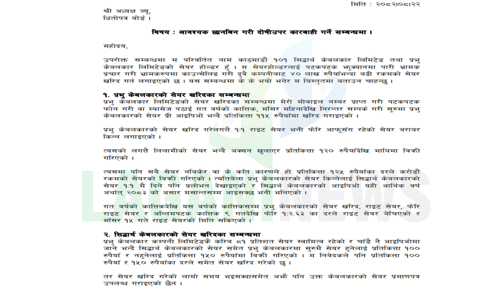 काठमाडौं । प्रभु केबलकार एण्ड टुरिजम लिमिटेड विरुद्ध धितोपत्र बोर्ड, नेपाल प्रहरीको केन्द्रीय अनुसन्धान ब्यूरो (सीआईबी), कम्पनी रजिष्ट्रारको कार्यालय र नेपाल स्टक एक्सचेञ्ज (नेप्से) मा उजुरी परेको छ । प्रभु केवलकारका सेयरधनीले उक्त कम्पनीका साथै सिद्धार्थ केवलकारविरुद्ध सोमबार चार वटै निकायमा उजुरी दिएका हुन् ।