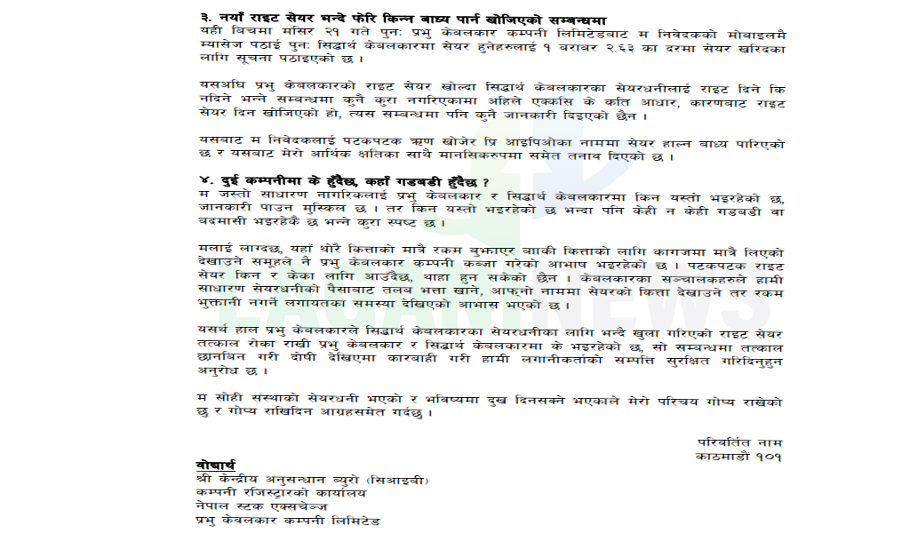 ‘नयाँ राइट सेयर भन्दै फेरि किन्न बाध्य पार्न खोजिएको सम्बन्धमा यही बिचमा मंसिर २१ गते पुनः प्रभु केबलकार कम्पनी लिमिटेडबाट म निवेदकको मोबाइलमै म्यासेज पठाई पुनः सिद्धार्थ केबलकारमा सेयर हुनेहरुलाई १ः२.६३ का दरमा सेयर खरिदका लागि सूचना पठाइएको छ’ उजुरीमा भनिएको छ ‘यसअघि प्रभु केबलकारको राइट सेयर खोल्दा सिद्धार्थ केबलकारका सेयरधनीलाई राइट दिने कि नदिने भन्ने सम्बन्धमा कुनै कुरा नगरिएकामा अहिले एक्कासी के कति आधार, कारणबाट राइट सेयर दिन खोजिएको हो, त्यस सम्बन्धमा पनि कुनै जानकारी दिइएको छैन । यसबाट म निवेदकलाई पटकपटक ऋण खोजेर प्रि–आईपीओका नाममा सेयर हाल्न बाध्य पारिएको छ र यसबाट मेरो आर्थिक क्षतिका साथै मानसिकरुपमा समेत तनाव दिएको छ ।’