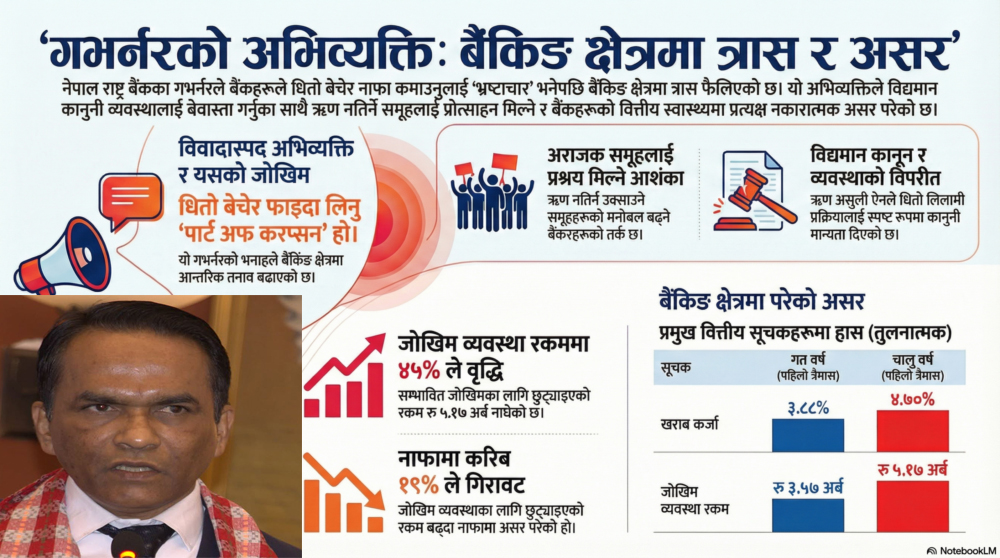 गभर्नरको उक्त भनाइका कारण बैंकिङ क्षेत्रमा आन्तरिक तनाव बढेको बताइन्छ । गलत कार्य गर्नेहरुलाई कारबाही गर्नु राज्यको दायित्व हो । बैंकले ऋण दिँदा धितो राख्ने, असुली नभएपछि धितो लिलामी गर्ने तथा आवश्यक परे बैंकले नै सकार्ने कानूनी व्यवस्था छ ।