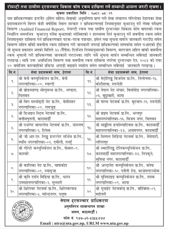 काठमाडौं । नेपाल दूरसञ्चार प्राधिकरणले २० वटा इन्टरनेट सेवाप्रदायक कम्पनीहरुलाई ३५ दिनभित्र रोयल्टी र ग्रामीण दूरसञ्चार विकास कोष (आरटीडीएफ)को शुल्क तिर्न ताकेता गरेको छ । प्राधिकरणले उक्त शुल्क ३५ दिन भित्र तिर्न सार्वजनिक सूचना प्रकाशन गरेर हो ।