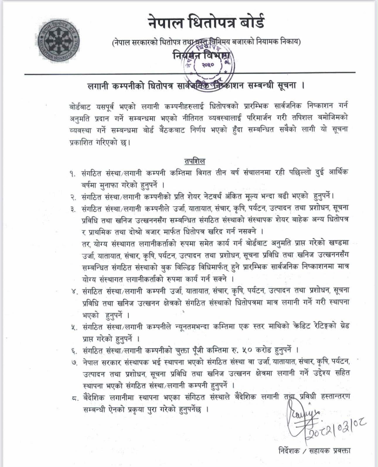 यसअघिको व्यवस्थालाई संशोधन गर्दै नयाँ ८ बुँदे निर्देशन जारी गरेको छ । बोर्डको सञ्चालक समितिले गरेको निर्णय अनुसार आईपीओ निष्कासन गर्न लागेका कम्पनीका लागि नयाँ व्यवस्था लागू हुनेछ ।