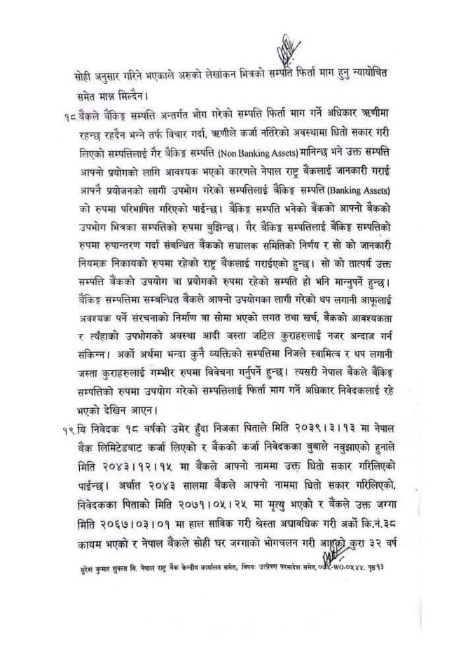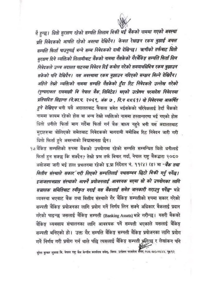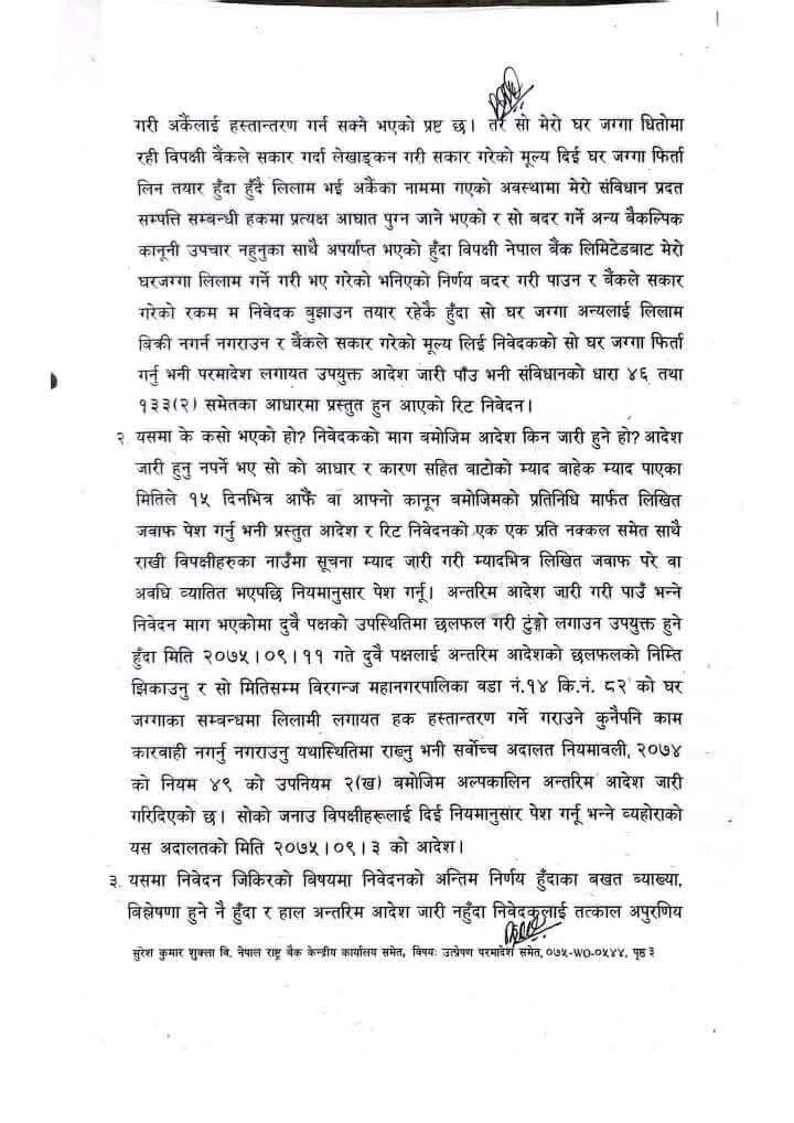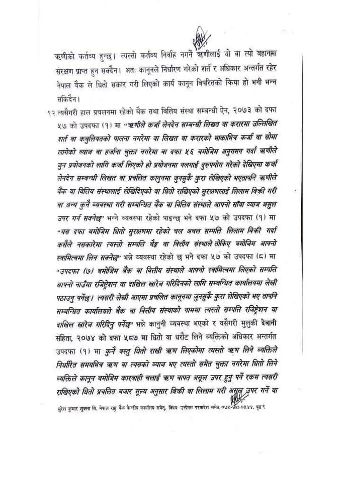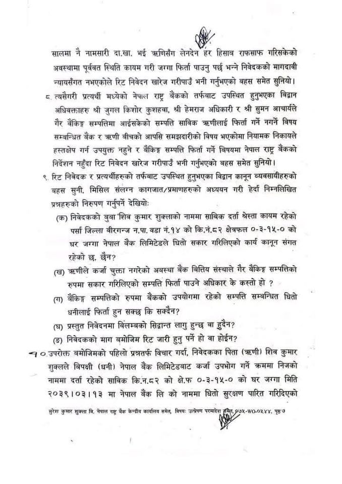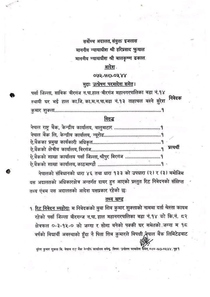 सर्वोच्च अदालतमा सुरेश कुमार शुक्लाले दिएको रित निवेदनको फैसला गर्दै यस्तो आदेश दिएको हो । शिव कुमार शुक्लाले पर्सा जिल्ला विरगञ्ज नगरपालिका १४ स्थित कित्ता नम्बर ८२ को ३ कठ्ठा १५ धुर जग्गा धितो राखी नेपाल बैंकबाट कर्जा लिएका थिए ।