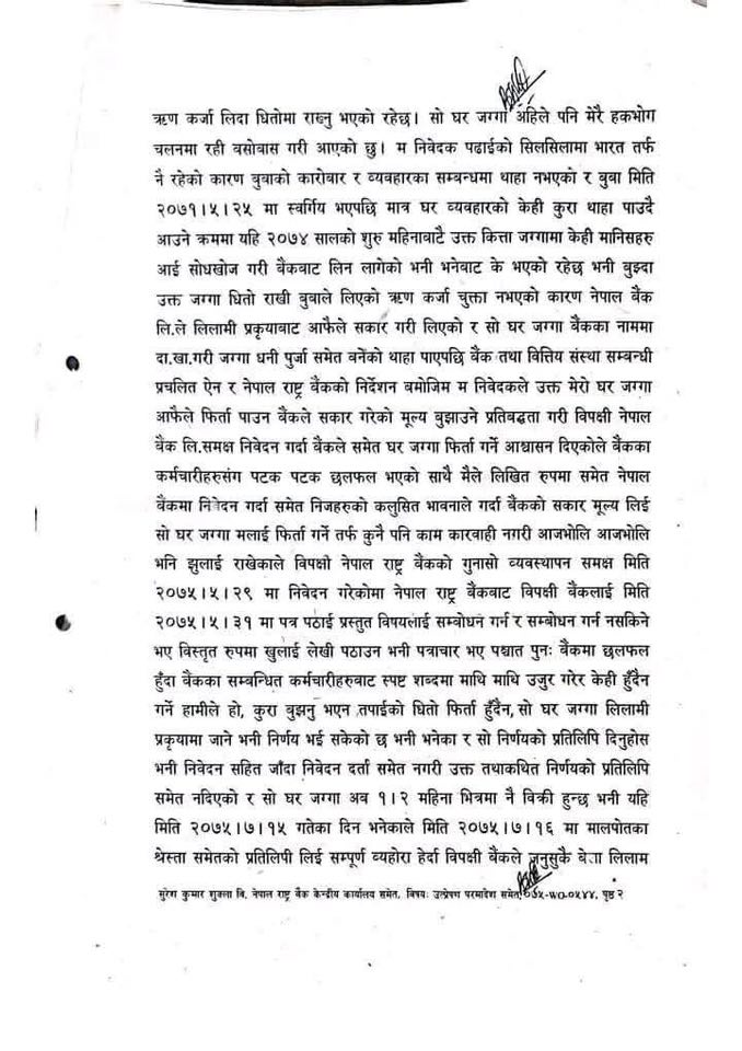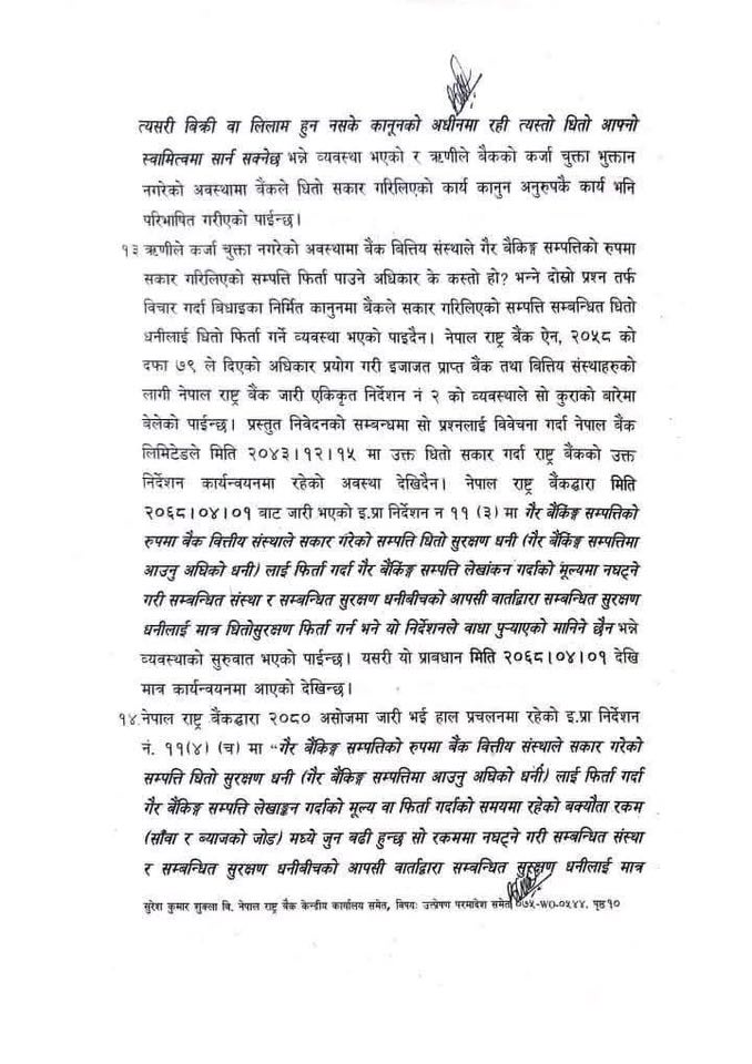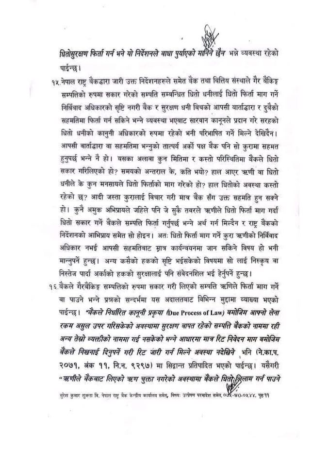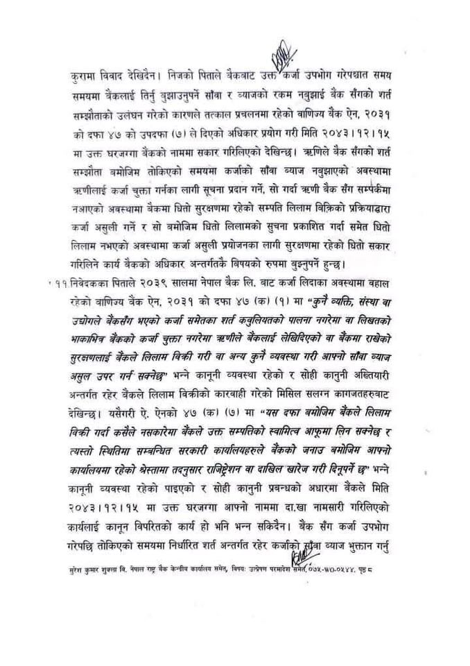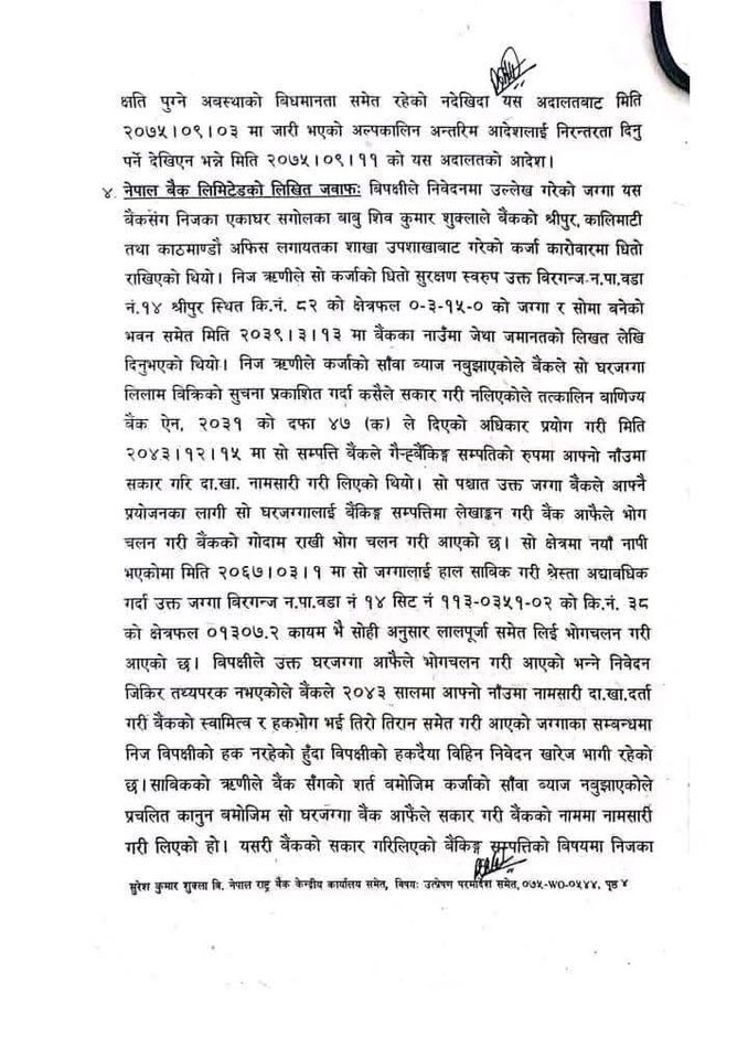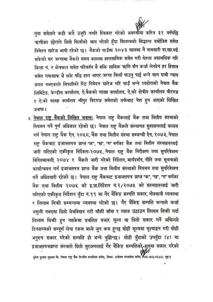 सर्वोच्च अदालतमा सुरेश कुमार शुक्लाले दिएको रित निवेदनको फैसला गर्दै यस्तो आदेश दिएको हो । शिव कुमार शुक्लाले पर्सा जिल्ला विरगञ्ज नगरपालिका १४ स्थित कित्ता नम्बर ८२ को ३ कठ्ठा १५ धुर जग्गा धितो राखी नेपाल बैंकबाट कर्जा लिएका थिए ।