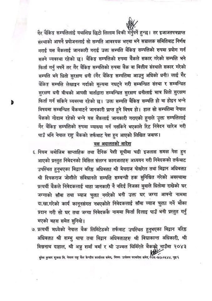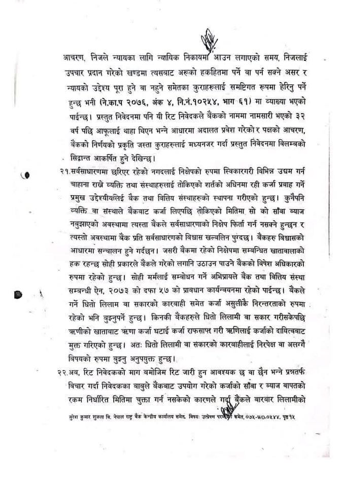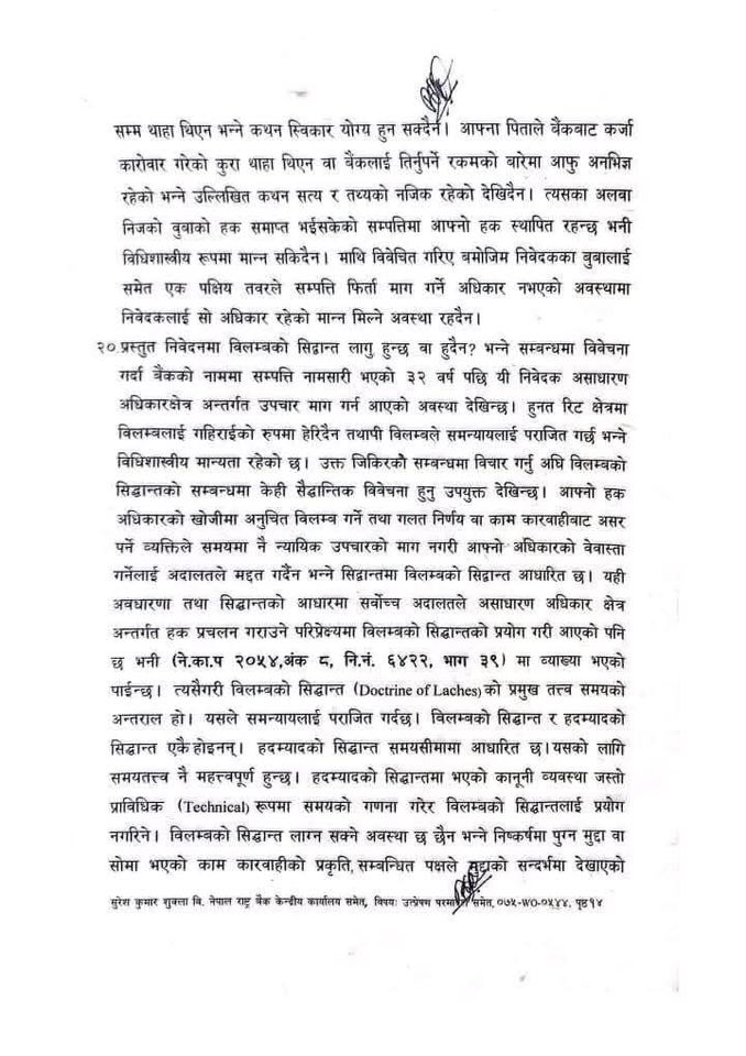 अदालतको फैसलामा भनिएको छ “निवेदकका बाबुले बैंकबाट उपयोग गरेको कर्जाको साँवा र ब्याज वापतको रकम निर्धारित मितिमा चुक्ता गर्न नसकेको कारणले गर्दा बैंकले बारबार लिलामीको सूचना प्रकाशित गर्दा समेत धितो लिलामी हुन नसकी बाणिज्य बैंक ऐन, २०३१ को दफा ४७ (क) (७) बमोजिम बैंकको नाममा सकार गरी लिएको र उक्त गैर बैंकिङ्ग सम्पत्तिलाई आफ्नै प्रोजनका लागी बैंकिङ्ग सम्पत्तिमा परिणत गरी आफैले प्रयोग गरिरहेको पाईएको निवेदकका बाबु स्वंयमले उक्त सम्पत्तिको लिलाम कारबाहीका सम्बन्धमा कुनै दावी उजुरी नगरी स्वीकार गरी बसेको लामो समयको अन्तरालपछि छोराले धितो फिर्ताको लागी बैंक समक्ष निवेदन गरेको कुरा स्वभाविक नदेखिएको ३२ वर्षको अन्तरालमा धितो फिर्ताको कारवाही चलाएको कुराको यथार्थपरक नरहेको र गैर बैंकिङ्ग सम्पत्तिको रूपमा रहेको सम्पत्ति फिर्ता गर्ने वा नगर्ने भन्ने कुरा सम्बन्धित बैंक वा ऋणीबीचको आपसी सहमतिमा निर्कयौल हुने विषयमा अदालतले हस्तक्षेप गर्नु उचित नहुने र वर्षौ पहिले कानुनी प्रकृया पुरा गरी बैंकले सकार गरिलिएको सम्पत्तिलाई बिना कुनै आधार औचित्य फिर्ता गर्दै जाने हो भने समग्र बैंकिङ्ग प्रणालीमा नै नकारात्मक परिणाम उत्पन्न हुन जाने भएको र बैंकले निवेदकको संविधान प्रदत्त हकमा कुनै प्रकारको असर पुर्याएको अवस्था नदेखिएको हुनाले निवेदक माग बमोजिम रिट निवेदन जारी गर्ने अवस्था नदेखिदा रिट खारेज हुने ठहर्छ ।”