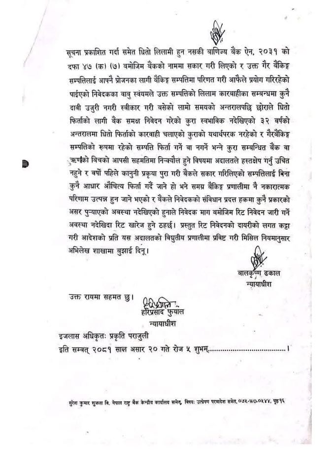 बैंकले घर जग्गा सकारेको ३२ वर्षपछि उनका छोरा काठमाडौं महानगरपालिका–१३ ताहाचल बस्ने सुरेश कुमार शुक्ला धितो फिर्ताका लागि भन्दै रिट निवेदन लिएर सर्वोच्च अदालत पुगेका थिए । सर्वोच्च अदालतका न्यायाधीश हरिप्रसाद फुयाल र बालकृष्ण ढकालको संयुक्त इजलासले बैंकबाट लिलामी भएको घर जग्गामा हकवालाले दाबी गर्न नमिल्ने फैसला गरेको छ ।