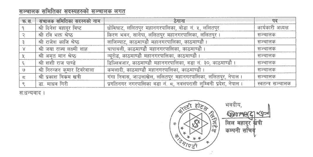 त्रिभुवन आर्मी अफिर्सस क्लबमा भएको सभाले ८ जना सन्चालक र एक जना स्वतन्त्र सन्चालकक चयन गरेको छ । कम्पनीले ऐनमा भएको व्यवस्था मानेको थियो भने २ जना स्वतन्त्र सञ्चालक चयन गर्नुपर्ने हो । उक्त ऐनमा भएको व्यवस्थालाई होटलले नमान्दा एक जना मात्रै स्वतन्त्र सञ्चालक चयन गरेको हो ।