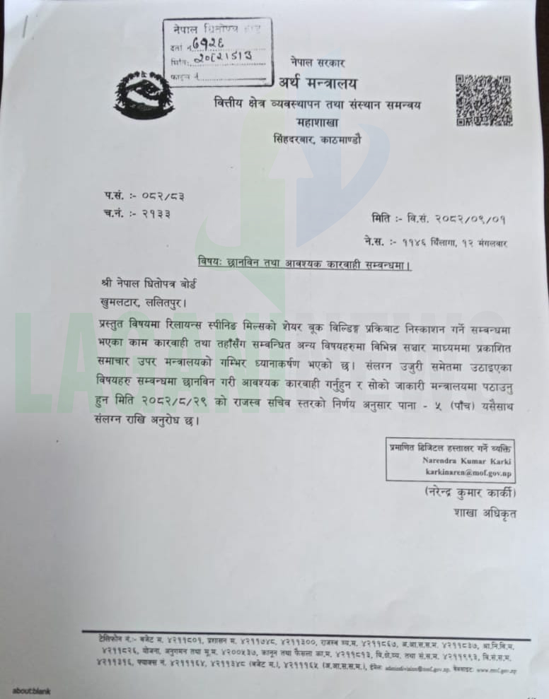 ‘रिलायन्स स्पीनिङ मिल्सको सेयर बुक विल्डिङ्ग प्रक्रिबाट निस्काशन गर्ने सम्बन्धमा भएका काम कारवाही तथा तहाँसँग सम्बन्धित अन्य विषयहरुमा विभिन्न सञ्चार माध्यममा प्रकाशित समाचार उपर मन्त्रालयको गम्भिर ध्यानाकर्षण भएको छ’ मन्त्रालयले पठाएको पत्रमा भनिएको छ ‘संलग्न उजुरी समेतमा उठाइएका विषयहरु सम्वन्धमा छानविन गरी आवश्यक कारवाही गर्नुहुन र सोको जाकारी मन्त्रालयमा पठाउनु मिति २०८२–८–२९ को राजस्व सचिव स्तरको निर्णय अनुसार अनुरोध छ’ भनिएको छ ।
