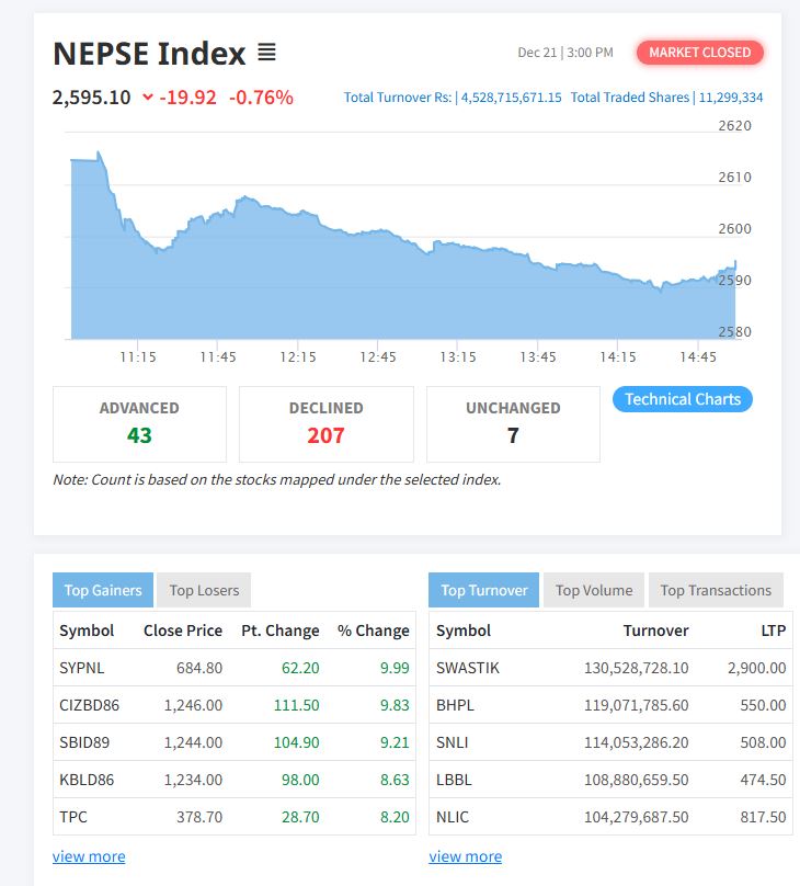 काठमाडौं । सेयर बजारमा दोहोरो अंकको गिरावट आएको छ । बजार मापन गर्ने सूचक १९.९० अंकले घटेर परिसूचक २५९५.१० बिन्दु कायम भएको छ ।