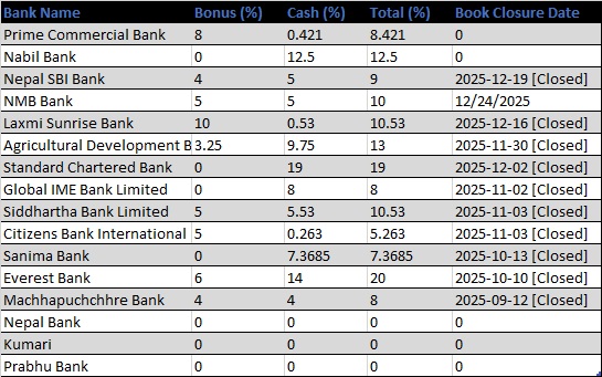 गत आर्थिक वर्षको नाफाबाट प्रभु बैंक, कुमारी बैंक र सरकारी स्वामित्व रहेको नेपाल बैंकले लगानीकर्ताको हात खाली बनाएका हुन । अहिलेसम्म प्राइम कमर्सियल, नबिल, नेपाल एसबिआई, एनएमबि, लक्ष्मी सनराईन, कृषि विकास, ग्लोबल आइएमई, एभरेष्ट, माछापुच्छ्रे, स्टयान्डर्ड चार्टर्ड, सिटिजन्स, सानिमा र सिद्धार्थ बैंकले लाभांश घोषणा गरेका छन् । जसमा केही बैंकले सभा बोलाएर सभाले तोकेको लाभांश पारित गरेको छ ।