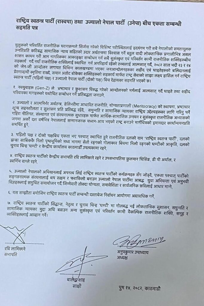 काठमाडौं । राष्ट्रिय स्वतन्त्र पार्टी (रास्वपा) र उज्यालो नेपाल पार्टीबीच एकता भई उज्यालो नेपाल पार्टी रास्वपामा विलय भएको छ। दुवै दलबीच विस्तृत सहमति–पत्रमा हस्ताक्षर भएसँगै नेपाली राजनीतिमा वैकल्पिक शक्तिहरूको एकीकरण भएको हो।