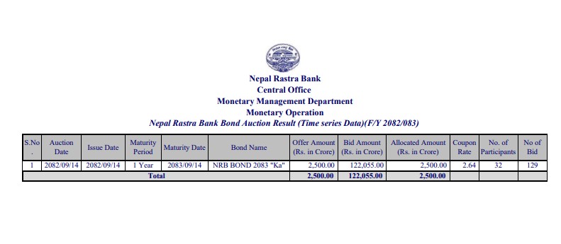 राष्ट्र बैंकका अनुसार लिलामी प्रक्रियामा ३२ वटा बैंक तथा वित्तीय संस्थाबाट १२९ वटा बोलपत्रमार्फत उक्त रकम बराबरको आवेदन प्राप्त भएको छ । यस ऋणपत्रको औसत कुपनदर अर्थात् ब्याजदर २.६४ प्रतिशत रहेको छ।