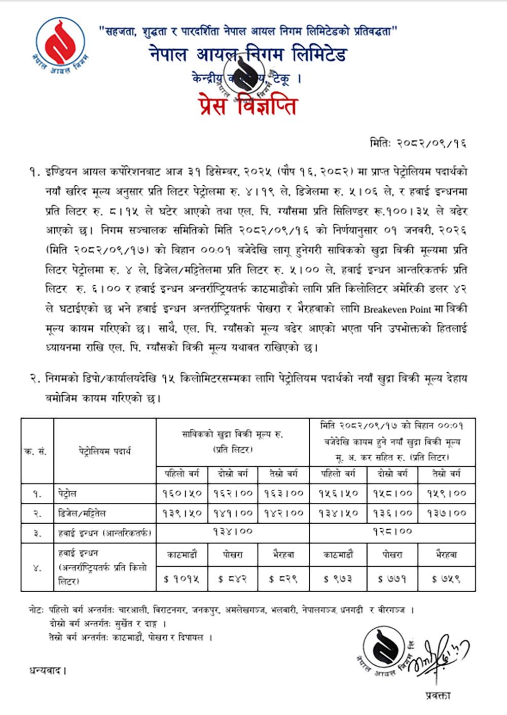 काठमाडौं । नेपाल आयल निगमले इन्धनको मूल्य घटाएको छ ।