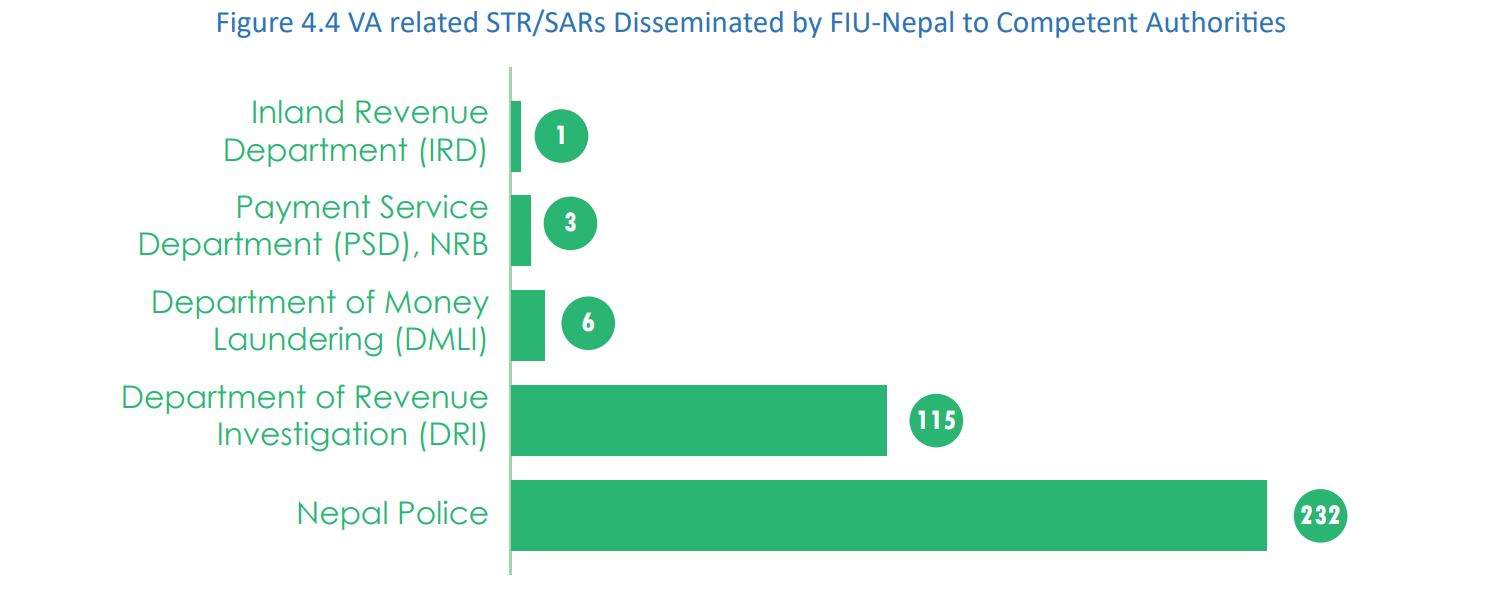 प्रतिवेदनअनुसार पछिल्लो पाँच वर्षमा राष्ट्र बैंकले २३२ वटा नेपाल प्रहरीलाई, ११५ वटा राजस्व अनुसन्धान विभागलाई, ६ वटा सम्पत्ति शुद्धीकरण अनुसन्धान विभागलाई, तीनवटा राष्ट्र बैंकअन्तर्गतको भुक्तानी सेवा विभागलाई र एउटा आन्तरिक राजस्व विभागलाई पठाएको छ ।