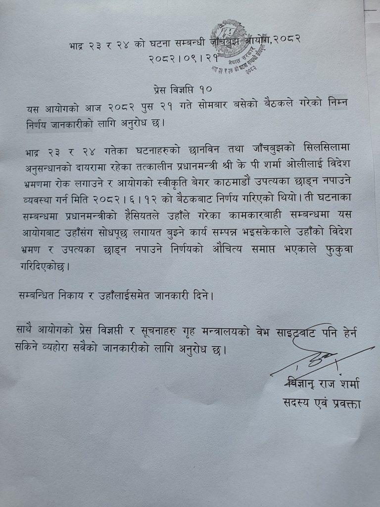 ओलीले आइतबार उच्चस्तरीय जाँचबुझ आयोगलाई लिखित बयान दिएका थिएन । भदौ २३ र २४ गते भएको जेनजी आन्दोलनका विषयमा उच्चस्तरीय जाँचबुझ आयोगलाई ओली बयान दिए लगत्तै आयोगले स्थान हद फुकुवा गरेको हो ।