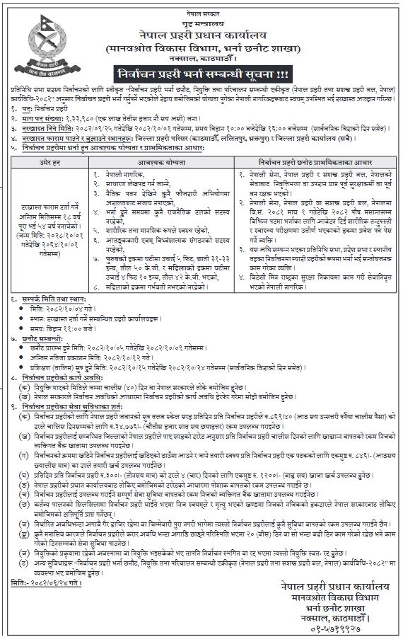 दर्खास्त उपत्यकाका साथै सबै जिल्ला प्रहरी कार्यालयमा दिन सकिने छ । दर्खास्त दिन १८ हजार पुरा भएर ५४ वर्ष ननाघेको हुनुपर्ने छ ।