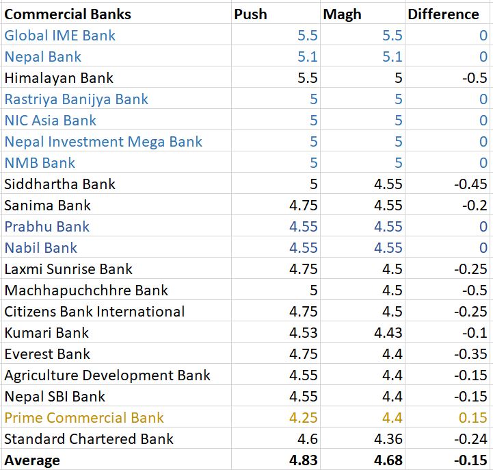 पुसको तुलनामा माघमा ११ बैंकहरुले ब्याजदर घटाएका छन् भने प्राइम बैंकको मात्रै ब्याजदर ०.१५ प्रतिशतले बढेर ४.४० प्रतिशत रहेको छ । पुसमा यस्तो ब्याजदर ४.२५ प्रतिशत रहेको थियो ।