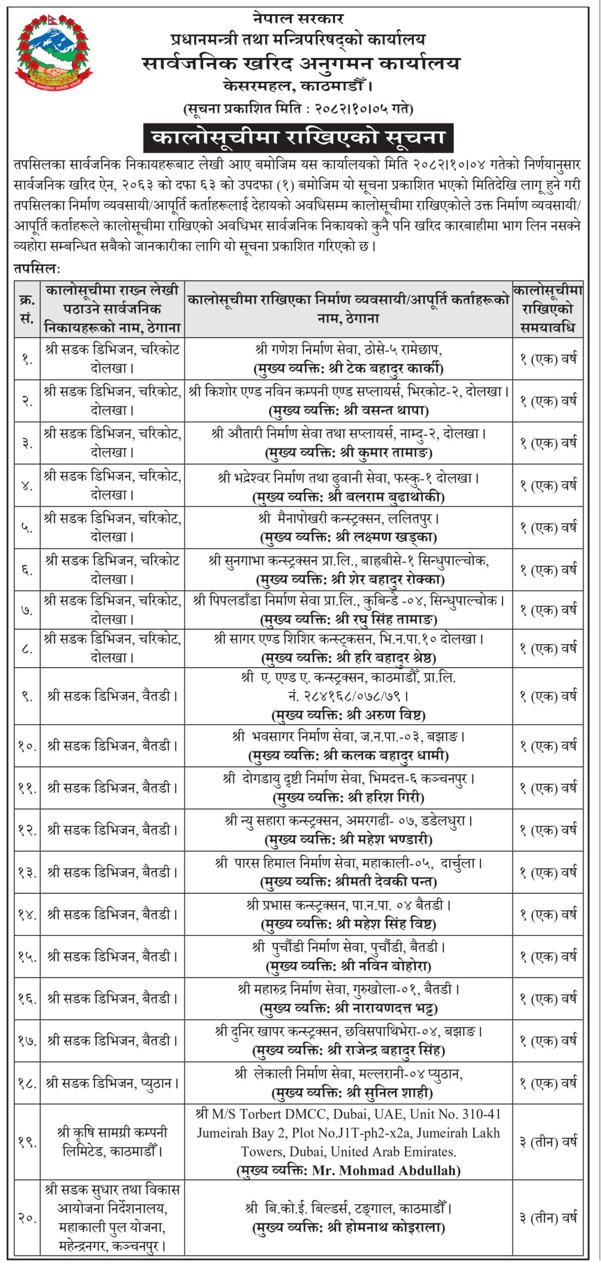 प्रधानमन्त्री तथा मन्त्रिपरिषद्को कार्यालयअन्तर्गतको उक्त कार्यालयले विभिन्न सार्वजनिक निकायको सिफारिसका आधारमा सार्वजनिक खरिद ऐन, २०६३ को दफा ६३ बमोजिम उनीहरूलाई कालोसूचीमा राख्ने निर्णय गरेको छ ।