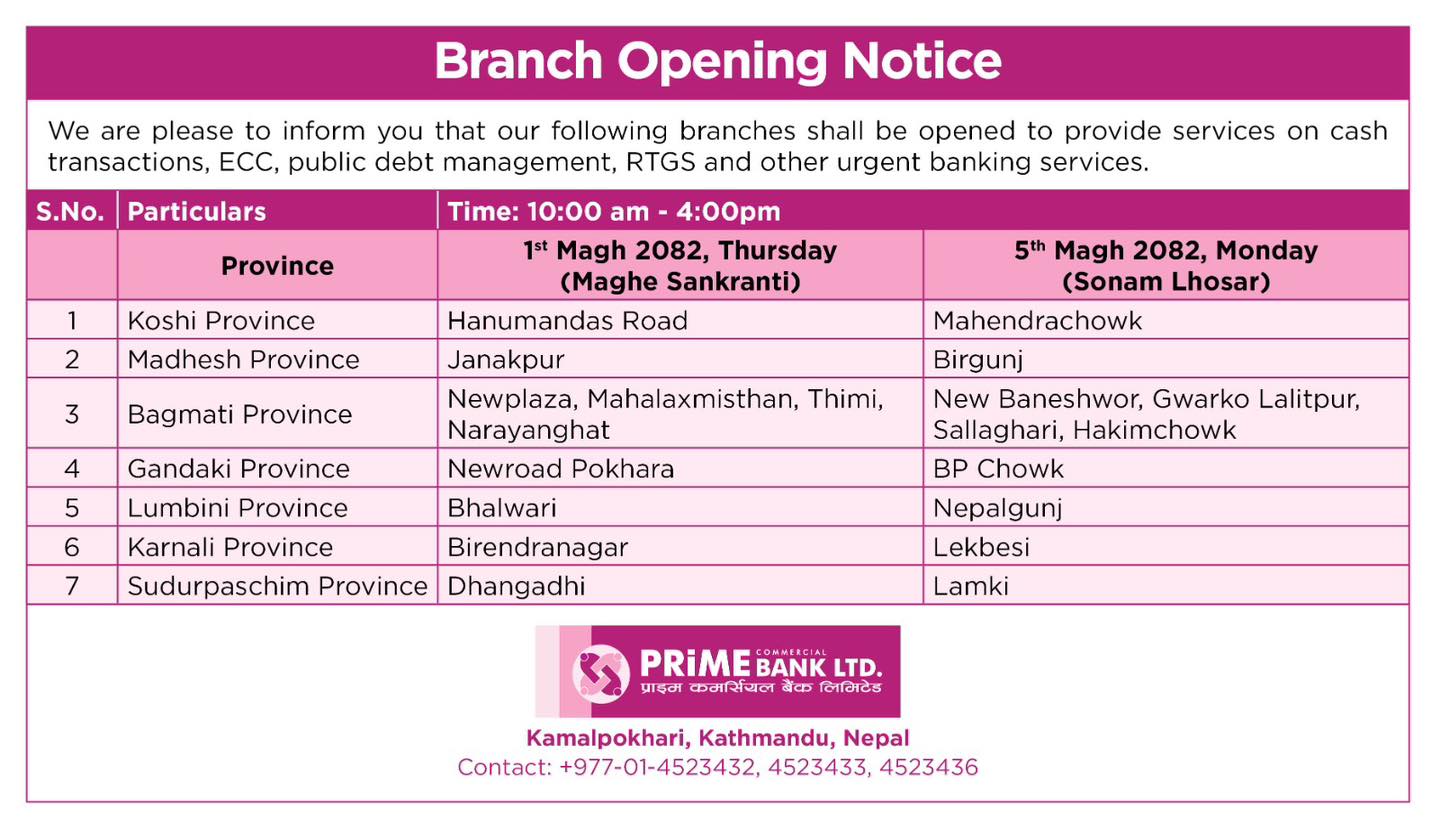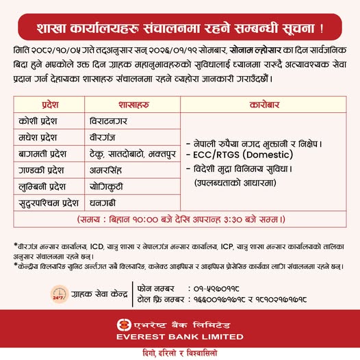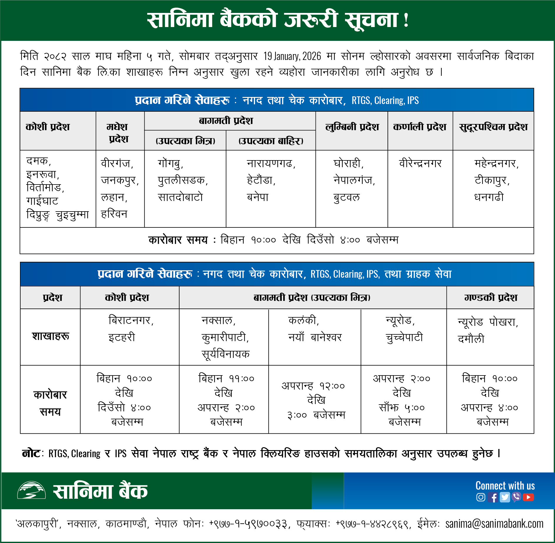 काठमाडौं । सरकारले तोकेको सार्वजनिक बिदाको दिन पनि बैंकहरुले शाखा खुला राख्ने भएका छन् । सरकारले सोमबार सोनाम लोसार भएकाले सार्वजनिक बिदा गरेको छ ।