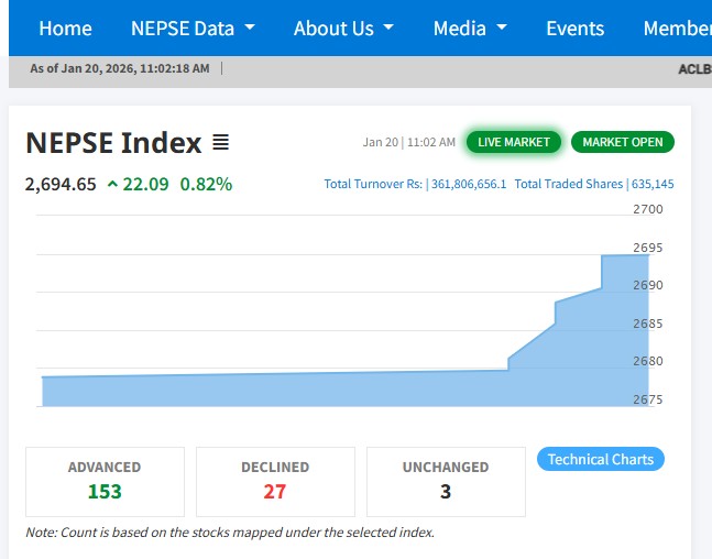 काठमाडौं । मंगलबार सेयर बजार कारोबार सुरु भएको ३ मिनेटमै २२ अंकले बढेको छ । आज नेप्से सूचक २२.०९ अंकले बढ्दै २,६९४.६५ विन्दुमा पुगेको छ।