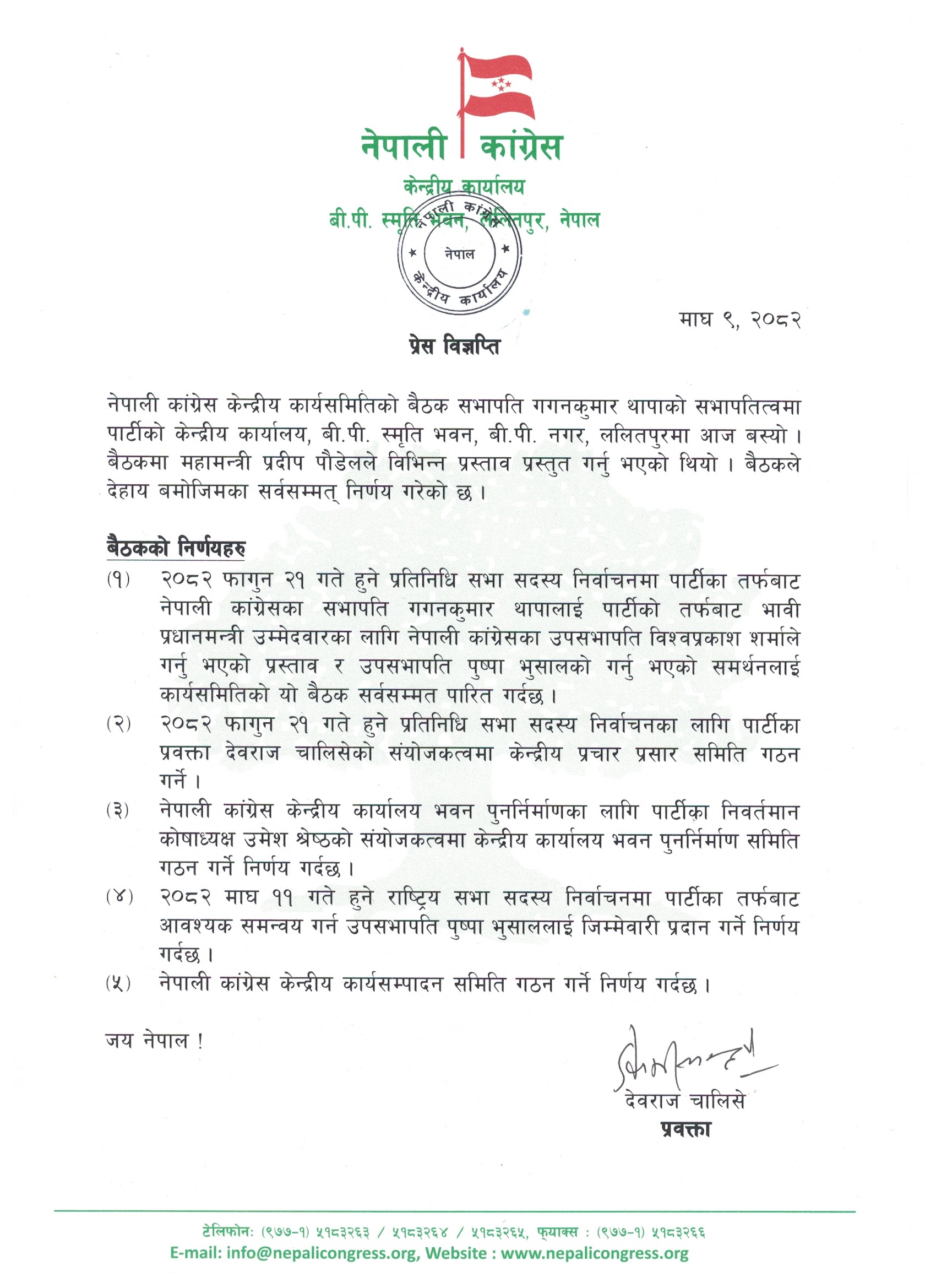 बैठकले २०८२ फागुन २१ गते हुने प्रतिनिधि सभा सदस्य निर्वाचनमा पार्टीका तर्फबाट सभापति गगनकुमार थापालाई भावी प्रधानमन्त्री उम्मेदवारका रूपमा अघि सार्ने निर्णय सर्वसम्मत् रूपमा पारित गरेको छ ।