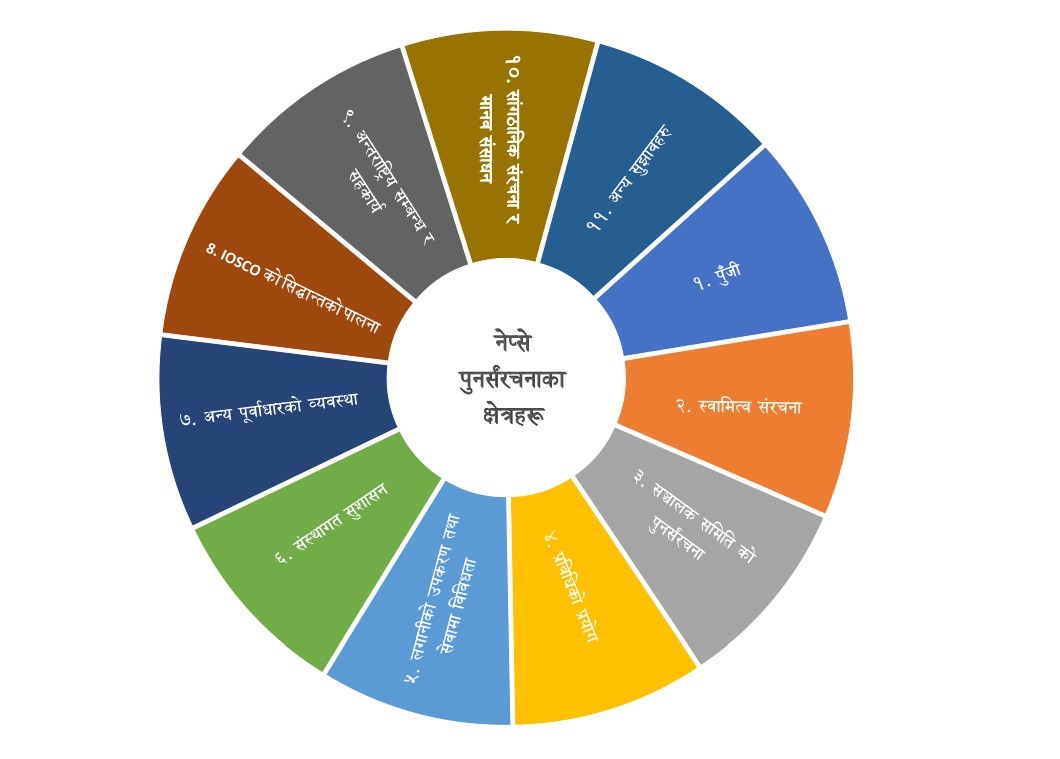 समितिले नेप्सेको पुँजी बढाउने, विदेशी रणनीतिक साझेदार भित्र्याउने, बैंक, बीमा भित्र्याउने, सरकारी स्वामित्व काम गर्न, बोनस सेयर जारी गर्ने, हकप्रद सेयर जारी गर्ने, सर्वसाधारणका लागि साधारण सेयर निष्कासन गर्ने योजना पेश गरेको छ । तर, नेप्से पुनर्सरचनाका लागि अर्थमन्त्री रामेश्वर खनालले सरकारी स्वामित्व पुरै हटाउनु पर्ने सुझावसहितको प्रतिवेदन माग गरेका थिए । तर, प्रतिवेदनले सरकारी स्वामित्व ५८.६६ प्रतिशतबाट १५.७३ प्रतिशत राख्नुपर्ने सुझाव दिएपछि मन्त्री खनाल फायर भएका छन् । उनले यो प्रतिवेदन कार्यान्वयन योग्य नरहेको संकेत समेत गरिसकेका छन् ।
