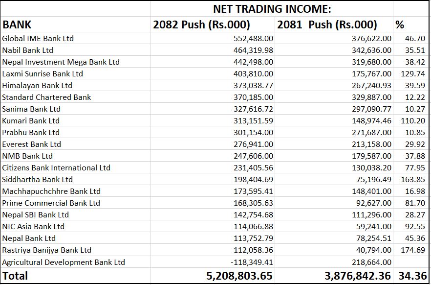 सञ्चालनमा रहेका वाणिज्य बैंकमा सबैभन्दा बढी नेट ट्रेडिङ इनकम ग्लोबल आइएमई बैंकको रहेको छ । बैंकको यस्तो इनमक ४६.७ प्रतिशतले बढेर ५५ करोड २४ लाख ८८ हजार रहेको छ । यस्तै नबिल बैंकको ३५.५१ प्रतिशतले बढेर ४६ करोड ४३ लाख १९ हजार, नेपाल इन्भेष्टमेन्ट मेगा बैंकको ३८.४२ प्रतिशतले बढेर ४४ करोड २४ लाख ९८ हजार, लक्ष्मी सनराज बैंकको १२९.७ प्रतिशतले बढेर ४० करोड ३८ लाख १० हजार रुपैयाँ रहेको छ ।