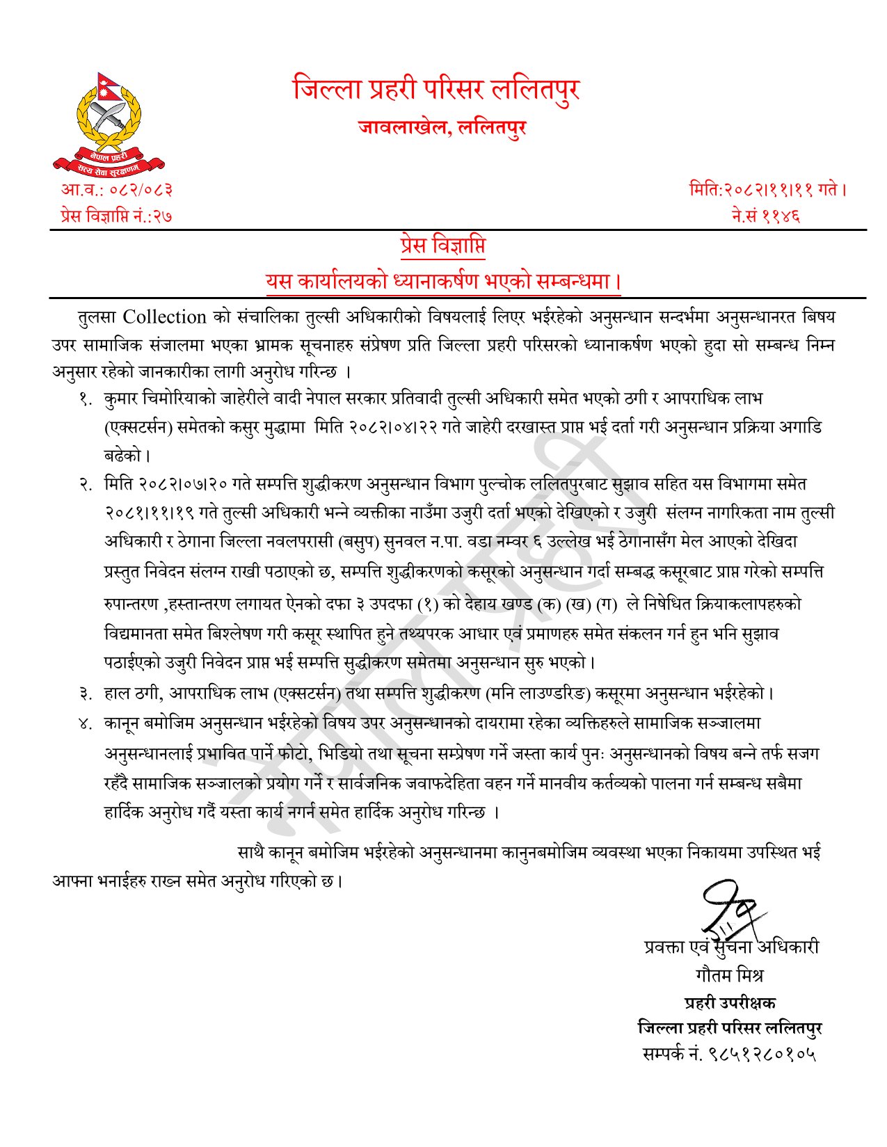 यस्तै गत कात्तिक २० गते सम्पत्ति शुद्धीकरण अनुसन्धान विभागले अनुसन्धानका लागि पत्राचार गरेको प्रहरीले जनाएको छ। विभागमा गत फागुन १९ गते तुल्सीविरूद्ध उजुरी दर्ता भएको थियो ।