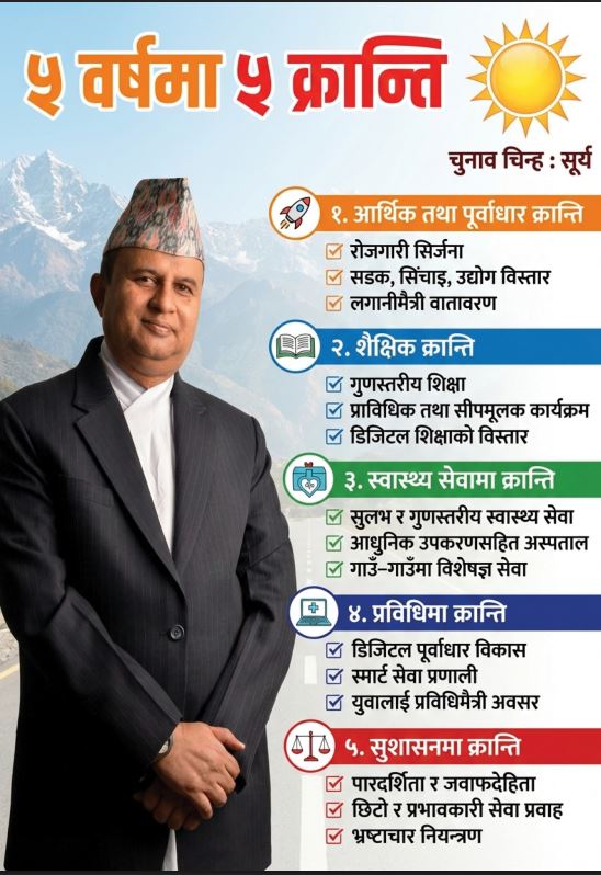 पोखरेलले ‘पाँच वर्षमा पाँच क्रान्ति’ शीर्षकको संकल्प आज यहाँ सार्वजनिक गरे । उक्त संकल्पमा रोजगारी सिर्जना, सडक, सिँचाइ र उद्योग विस्तारमार्फत आर्थिक तथा पूर्वाधार क्रान्ति अघि बढाउने योजना प्रस्तुत गरे ।