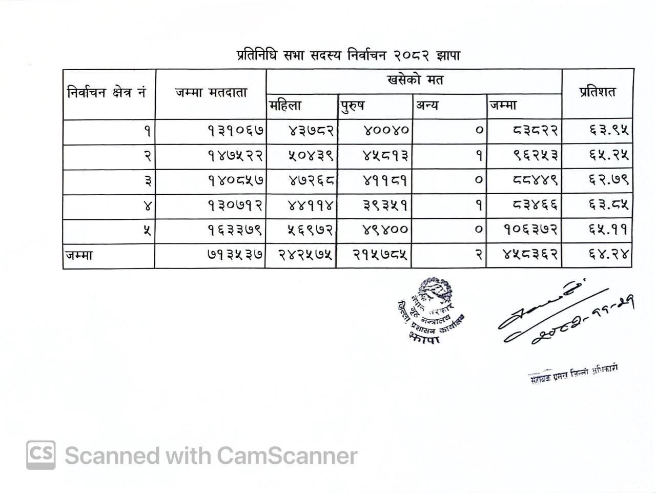 जसमा १ नम्बर क्षेत्रमा ६३.९५ प्रतिशत, २ मा ६५.२५ प्रतिशत, ३ मा ६२.७९ प्रतिशत ४ नम्बरमा ६३.८५ प्रतिशत र ५ नम्बरमा ६५.११ प्रतिशत मत खसेको छ ।