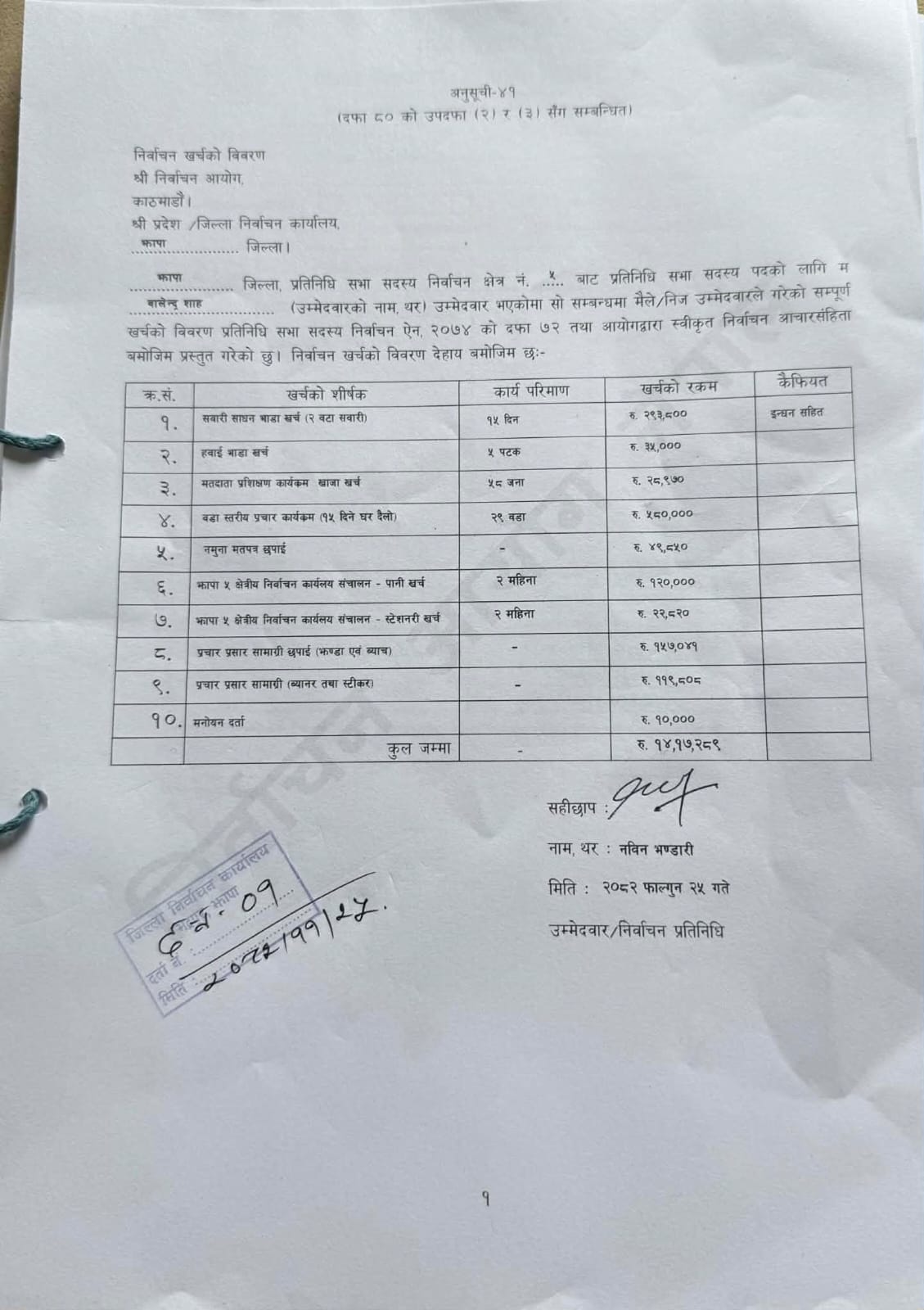 प्रचार–प्रसारका सामग्री खरिदतर्फ कागज तथा छपाइमा १ लाख ५७ हजार ४१ रुपैयाँ खर्च भएको देखाइएको छ भने ब्यानर तथा स्टिकरलगायत प्रचार सामग्रीमा १ लाख १९ हजार ८०८ रुपैयाँ खर्च भएको उल्लेख छ। मनोनयन दर्ता शुल्कबापत १० हजार रुपैयाँ खर्च भएको विवरणमा जनाइएको छ।