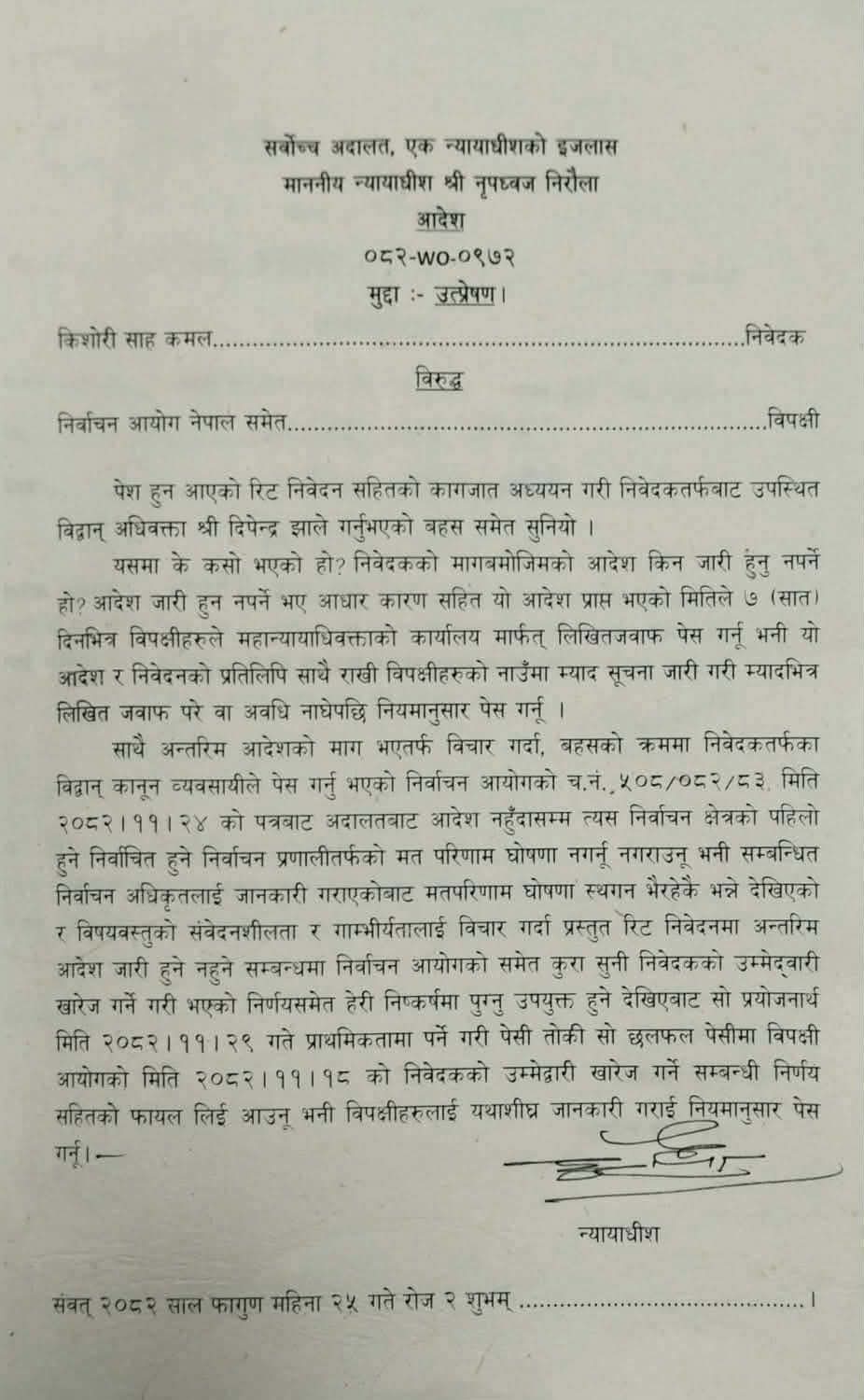 साहले निर्वाचन आयोग समेतलाई विपक्षी बनाई दायर गरेको उत्प्रेषणको रिटमाथि अदालतले ७ दिनभित्र लिखित जवाफ पेस गर्न आदेश दिएको छ । आदेशमा भनिएको छ, ‘विपक्षी आयोगको मिति २०८२–११–१८ को निवेदकको उम्मेदवारी खारेज गर्ने सम्बन्धी निर्णय सहितको फाइल लिई आउनू भनी विपक्षीहरूलाई यथाशीघ्र जानकारी गराई नियमानुसार पेस गर्नू ।’