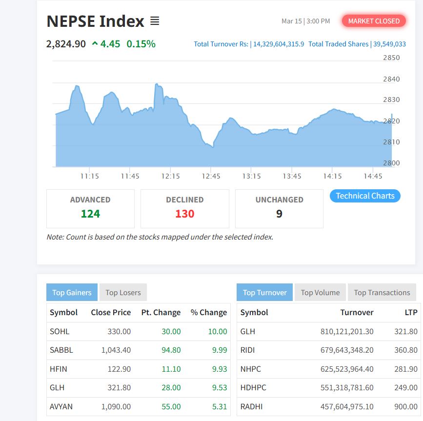 कारोबारमा १२४ कम्पनीको मूल्य बढेको छ भने १३० कम्पनीको मूल्य घटेको छ । कारोबारमा जीवन बीमा, लगानी होटल समूहको उपसूचक घटेको छ भने बाँकी समूहको उपसूचक बढेको छ ।