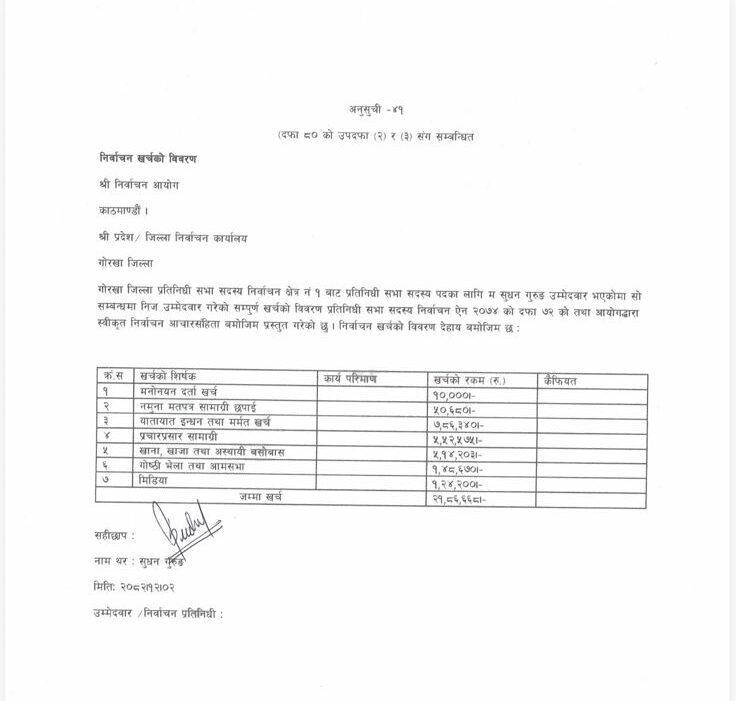 सुदन गुरुङले निर्वाचनमा गरे पौने २२ लाख खर्च, कुन शीर्षकमा कति?