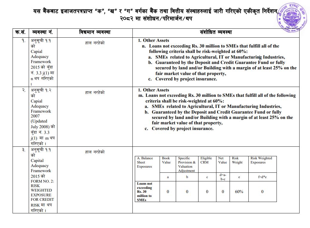 राष्ट्र बैंकले आज वाणिज्य बैंक, विकास बैंक र वित्त कम्पनीलाई निर्देशन जारी गर्दैै ३ करोड रुपैयाँसम्मको एसएमई कर्जाको जोखिम भार ६० प्रतिशतमा झारेको हो ।