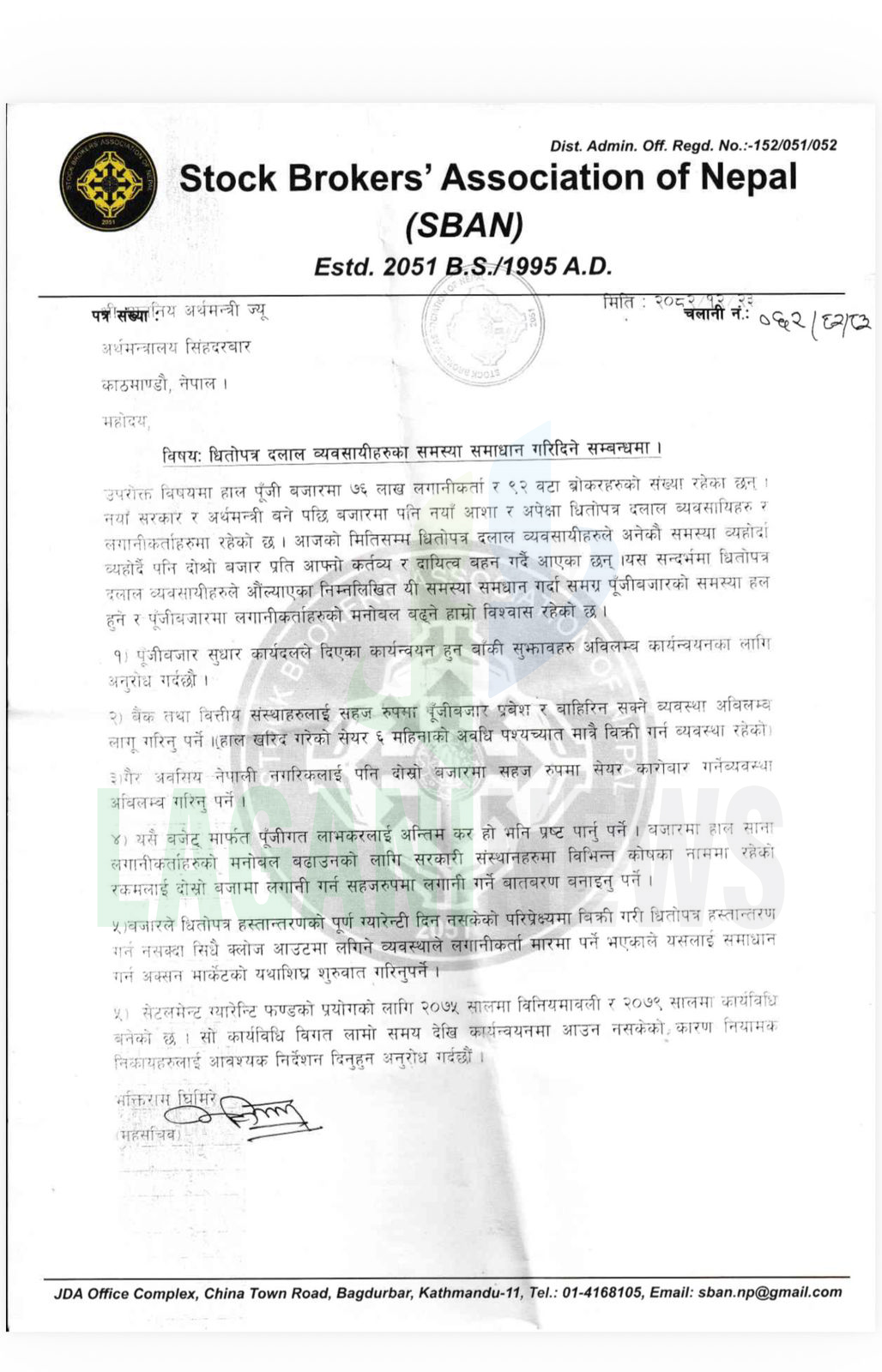 साथै एसोशिएसनले बजार सुधारको लागि सरकारले गर्न बाँकी काम समयमा नै गर्न, बैंक वित्तीय संस्थालाई लगाएको ६ महिनाको क्याप हटाउन, बजारमा गैर आवासीय नेपालीलाई सहजै भित्र्याउन, पुँजीगत लाभकर अन्तिम हो की अग्रिम हो क्लियर गर्न, सेटलमेन्ट ग्यारेन्टी फण्ड निस्कृय भएको र यो कार्यान्वयनका लागि सेबोन र नेप्सेलाई निर्देशन दिन मन्त्री समक्ष आग्रह गरेको घिमिरेले बताए ।