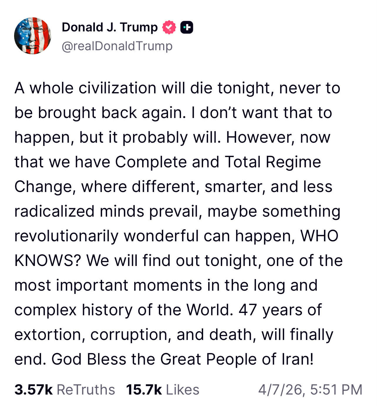 उनले इरानलाई समाप्त पार्न चाहेको सन्देश दिँदै यस्तो लेखेको हुन् ।  ‘अब पूर्ण र सम्पूर्ण शासन परिवर्तन भइसकेपछि, जहाँ फरक, बुद्धिमान र कम उग्र विचार भएका मानिसहरू हावी हुनेछन्, सायद केही क्रान्तिकारी रूपमा अद्भुत कुरा हुन सक्छ । कसलाई थाहा रु हामी आज राति थाहा पाउनेछौं यो विश्वको लामो र जटिल इतिहासको सबैभन्दा महत्वपूर्ण क्षणमध्ये एक हो । ४७ वर्षको जबर्जस्ती, भ्रष्टाचार र मृत्यु अन्ततः समाप्त हुनेछ। भगवान् इरानका महान जनतालाई आशीर्वाद दिनुहोस् ।’