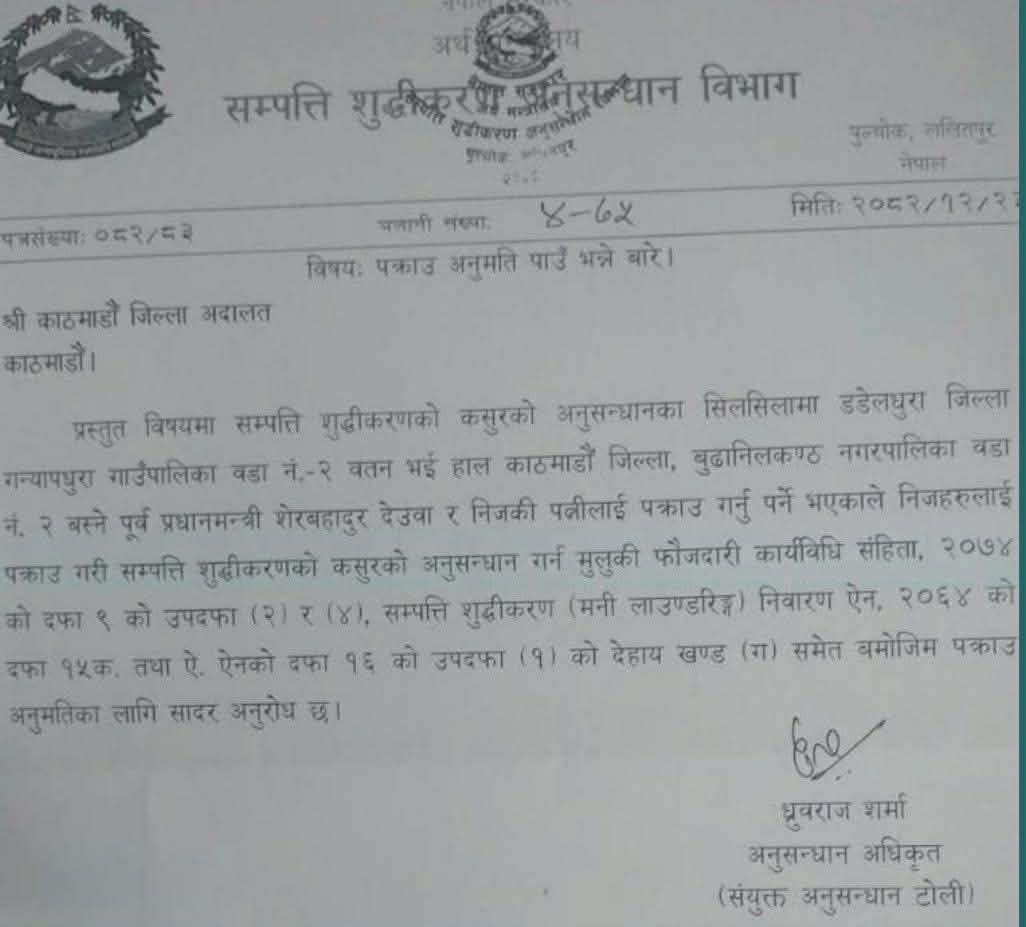 ‘सम्पत्ति शुद्धीकरणको कसुरको अनुसन्धानका सिलसिलामा डडेलधुरा जिल्ला गन्यापधुरा गाउँपालिका वडा-२ वतन भई हाल काठमाडौँ जिल्ला, बुढानीलकण्ठ नगरपालिका वडा- २ बस्ने पूर्व प्रधानमन्त्री शेरबहादुर देउवा र निजकी पत्नीलाई पक्राउ गर्नुपर्ने भएकाले निजहरूलाई पक्राउ गरी सम्पत्ति शुद्धीकरणको कसुरको अनुसन्धान गर्न मुलुकी फौजदारी कार्यविधि संहिता, २०७४ को दफा ९ को उपदफा (२) र (४), सम्पत्ति शुद्धीकरण (मनी लाउण्डरिङ्ग) निवारण ऐन, २०६४ को दफा १५क तथा ऐ. ऐनको दफा १६ को उपदफा (१) को देहाय खण्ड (ग) समेत बमोजिम पक्राउ अनुमतिका लागि सादर अनुरोध छ’ पत्रमा उल्लेख छ ।